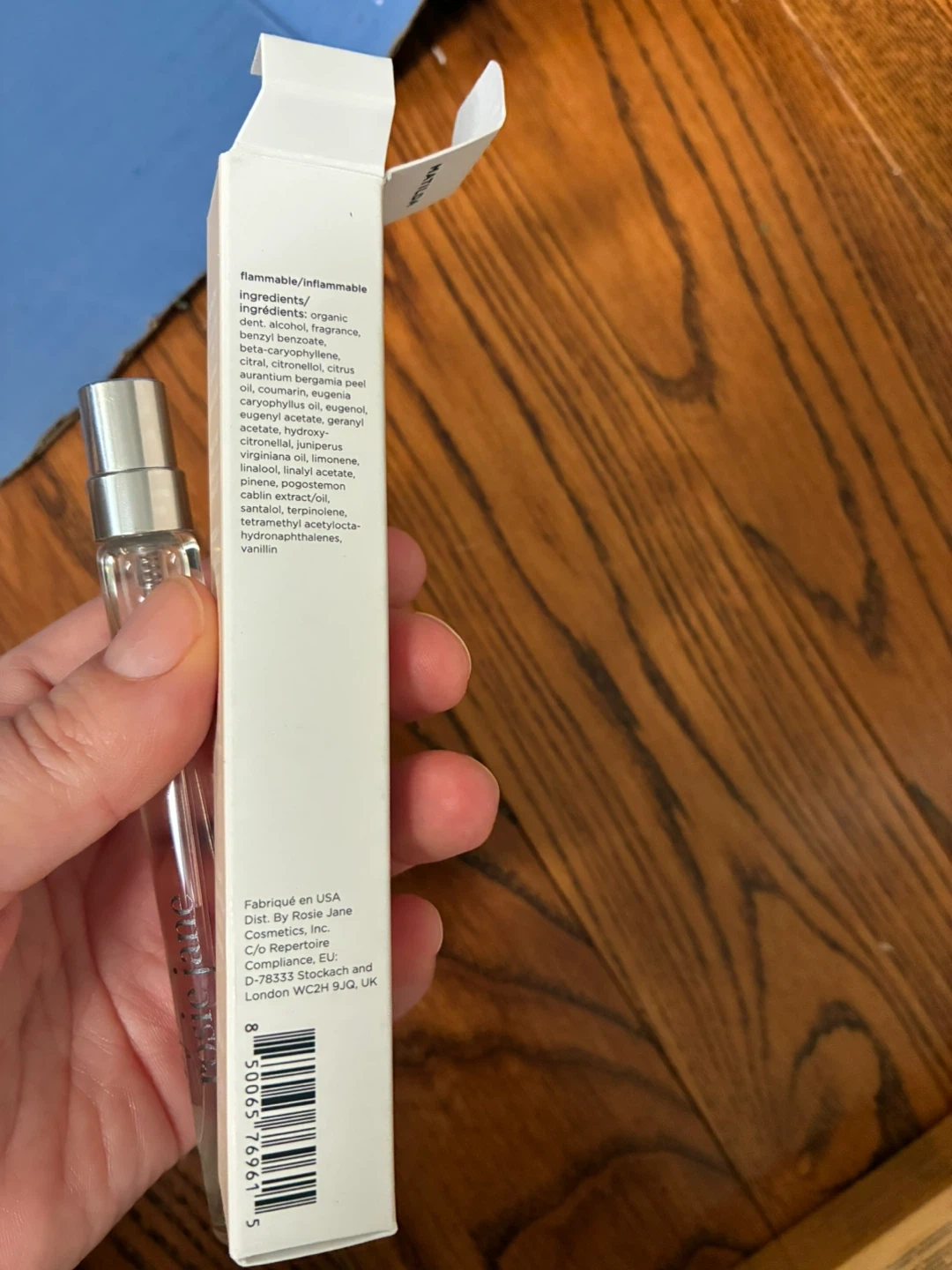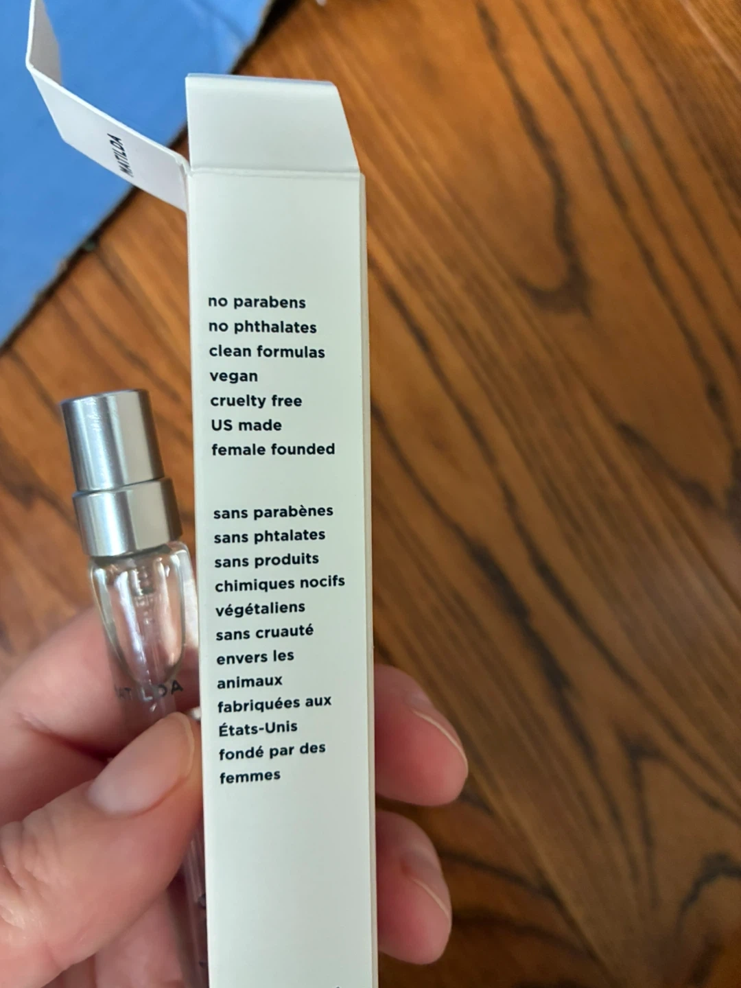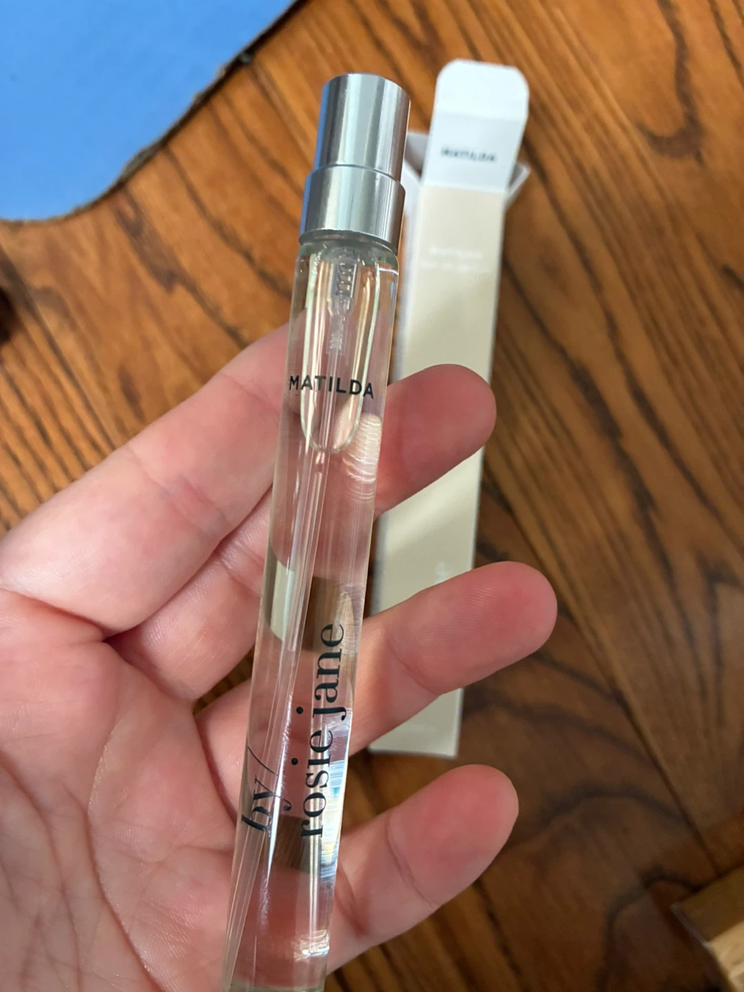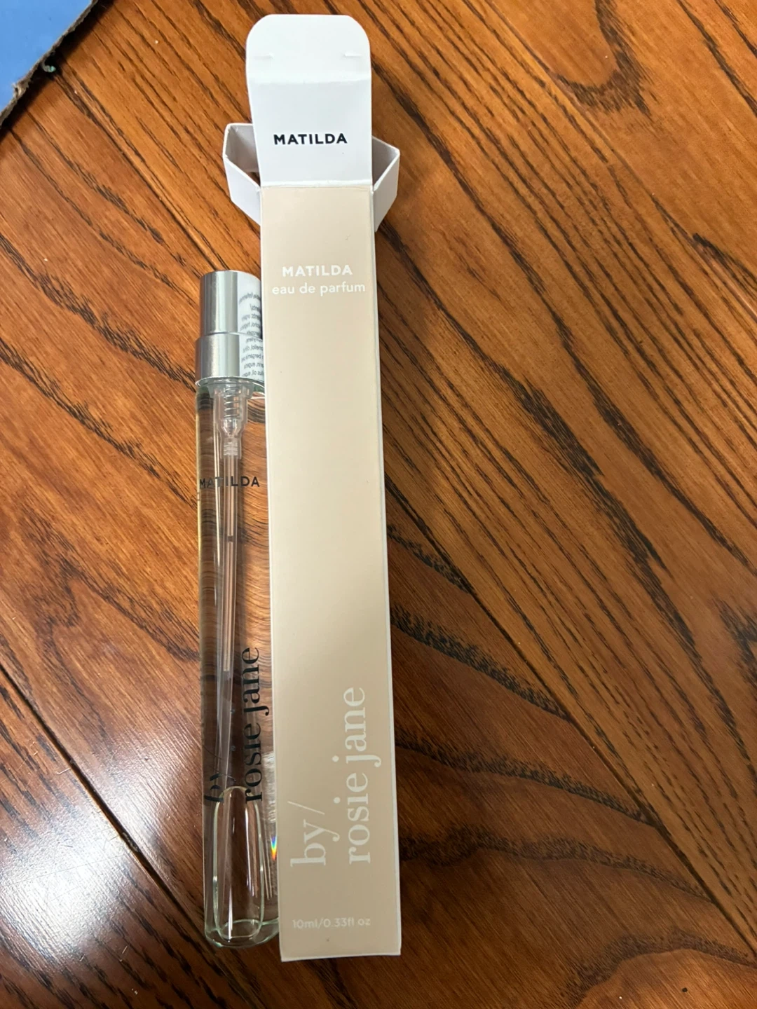 This is the Matilda by Rosie Jane eau de parfum in a travel-friendly spray. It's a vegan, cruelty-free formula made in the US. Fragrance notes include passion fruit tart, meringue, and golden musk.