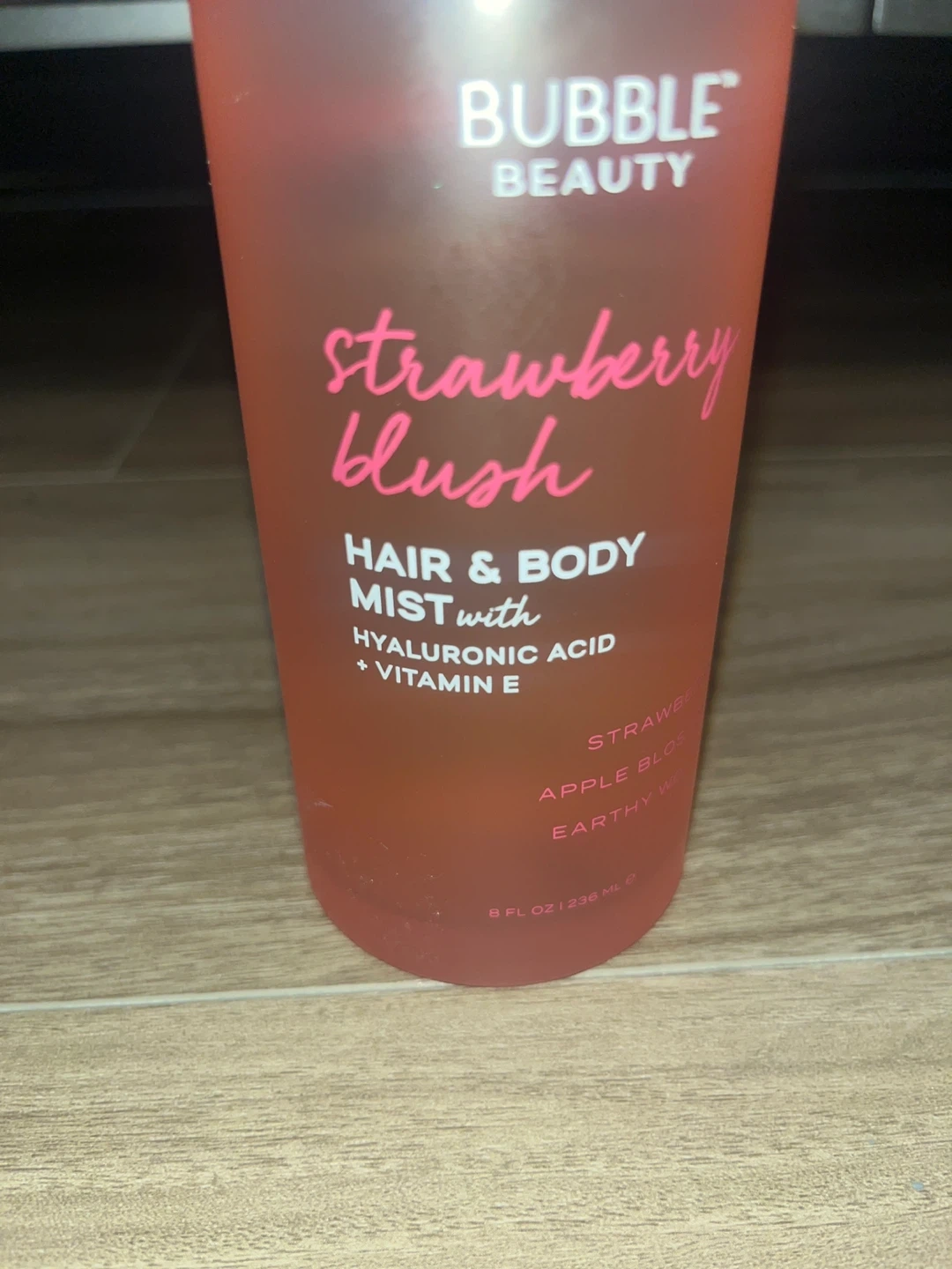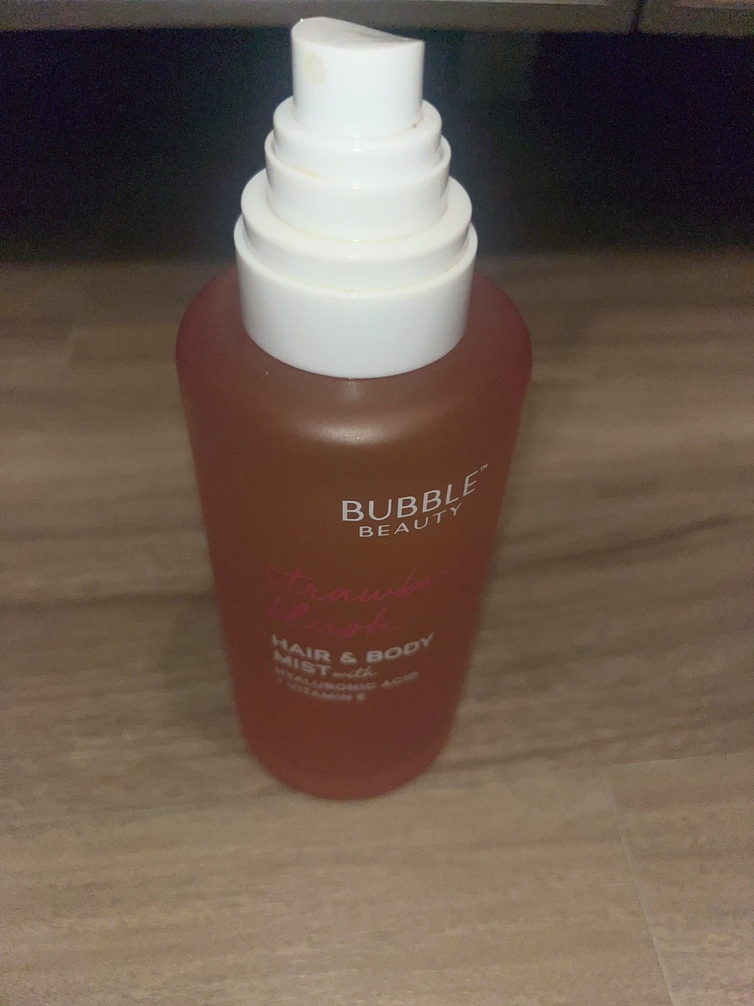 This is Bubble Beauty's Strawberry Blush hair and body mist. It's made with hyaluronic acid and vitamin E. Use it to refresh your hair and skin anytime!