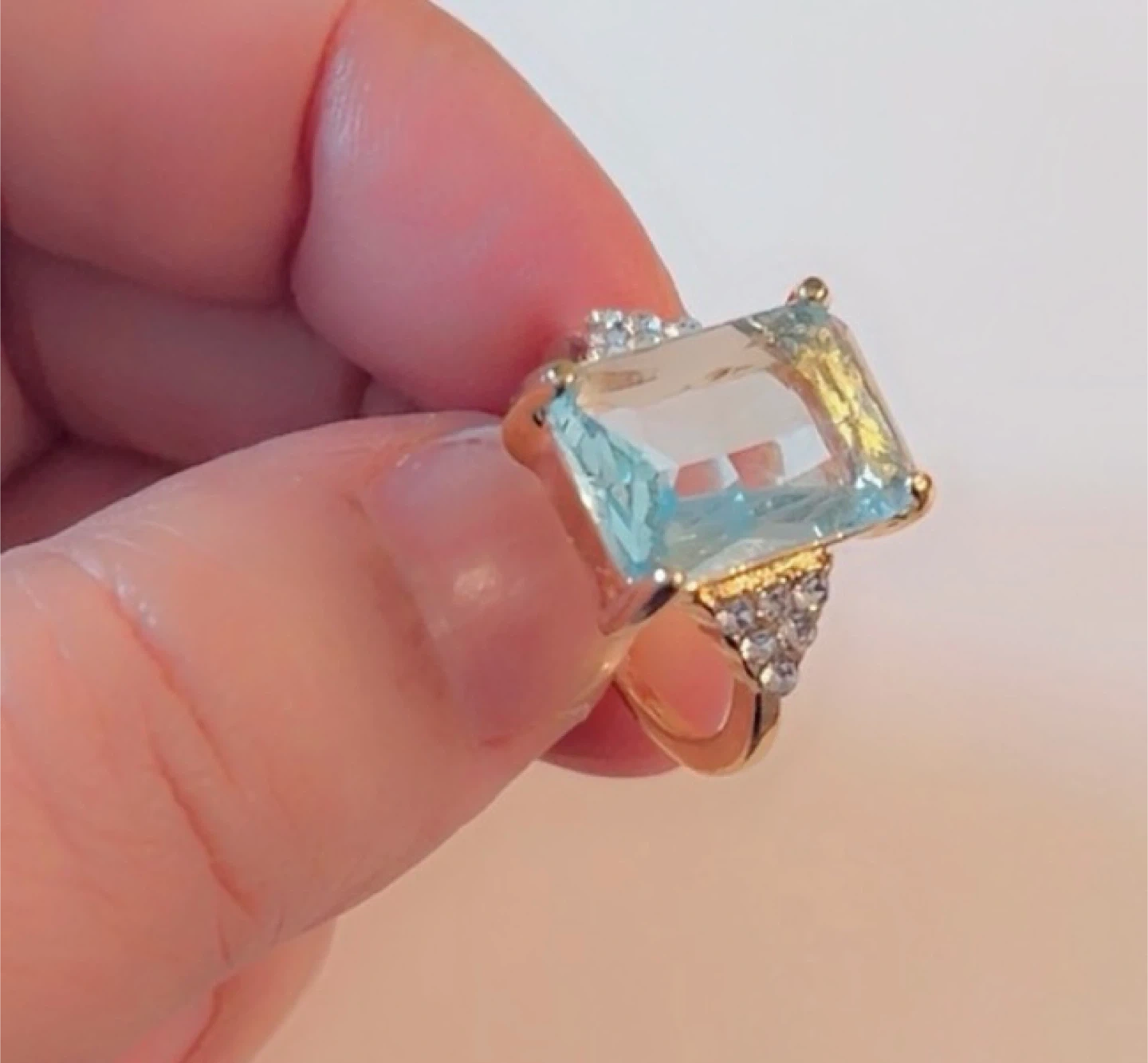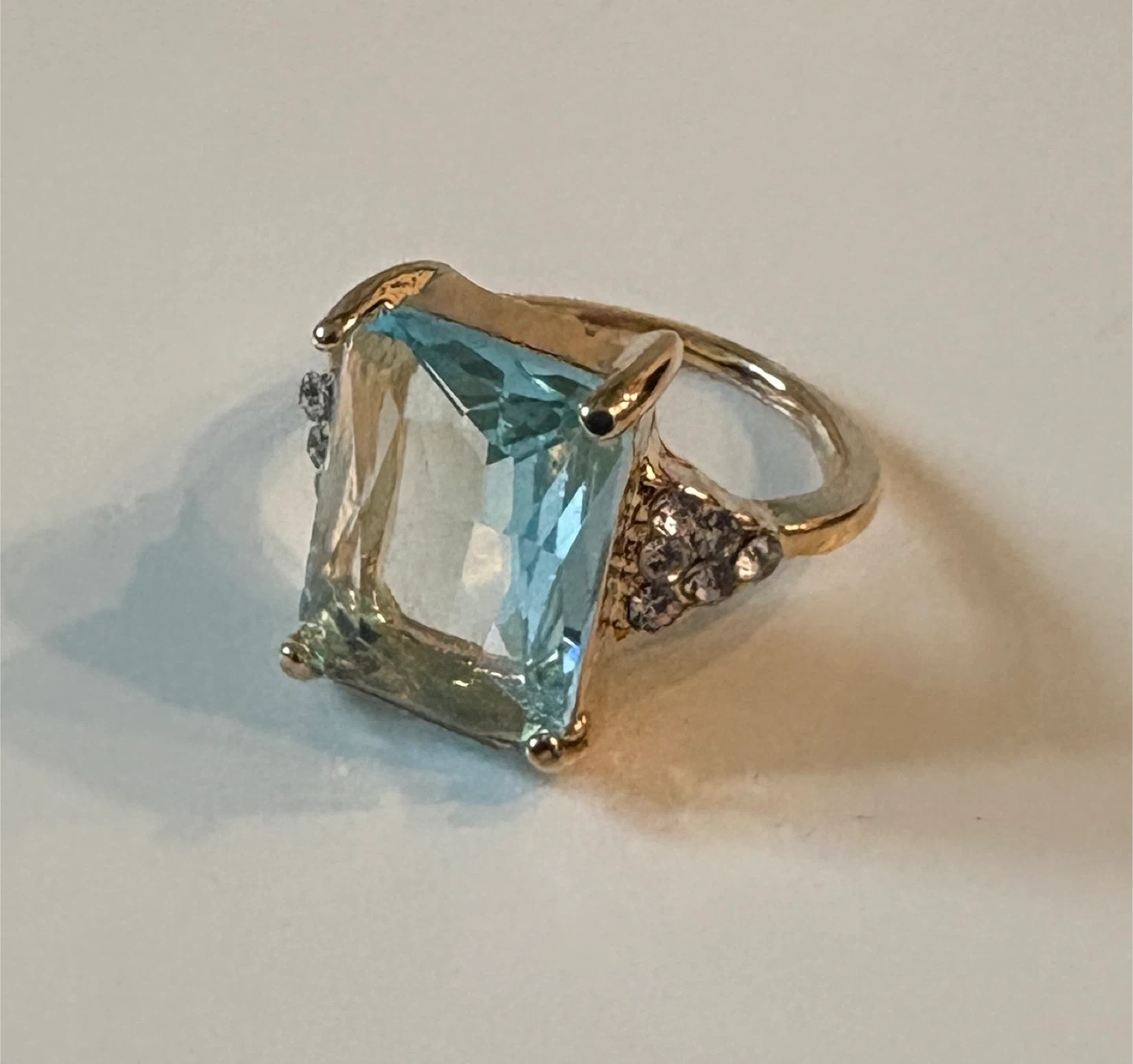 This beautiful ring features a large, light blue marquise-cut stone set in a gold-tone band. Small clear stones accent the sides of the setting. It's a stylish piece for any occasion!