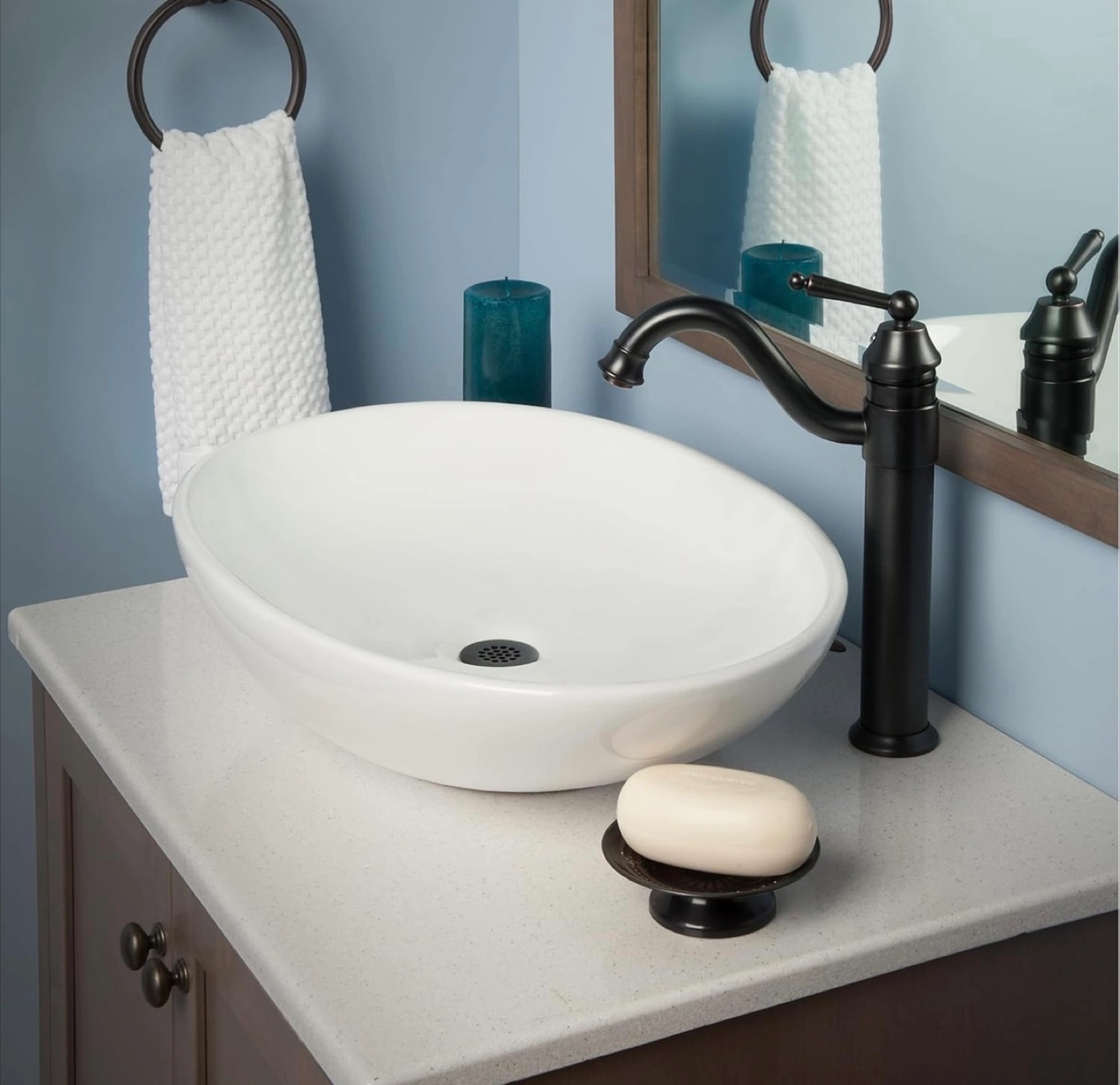 White ceramic vessel sink. Oval shape. Includes overflow drain. Modern design. Perfect for bathroom renovations.