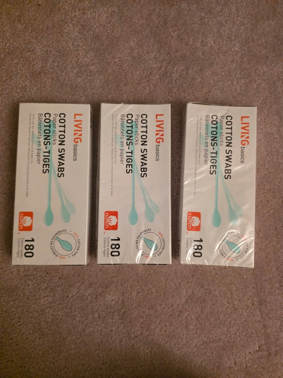 Three boxes of LIVING basics cotton swabs. Each box contains 180 paper stick cotton swabs with thick, soft tips. Ideal for personal and baby care.