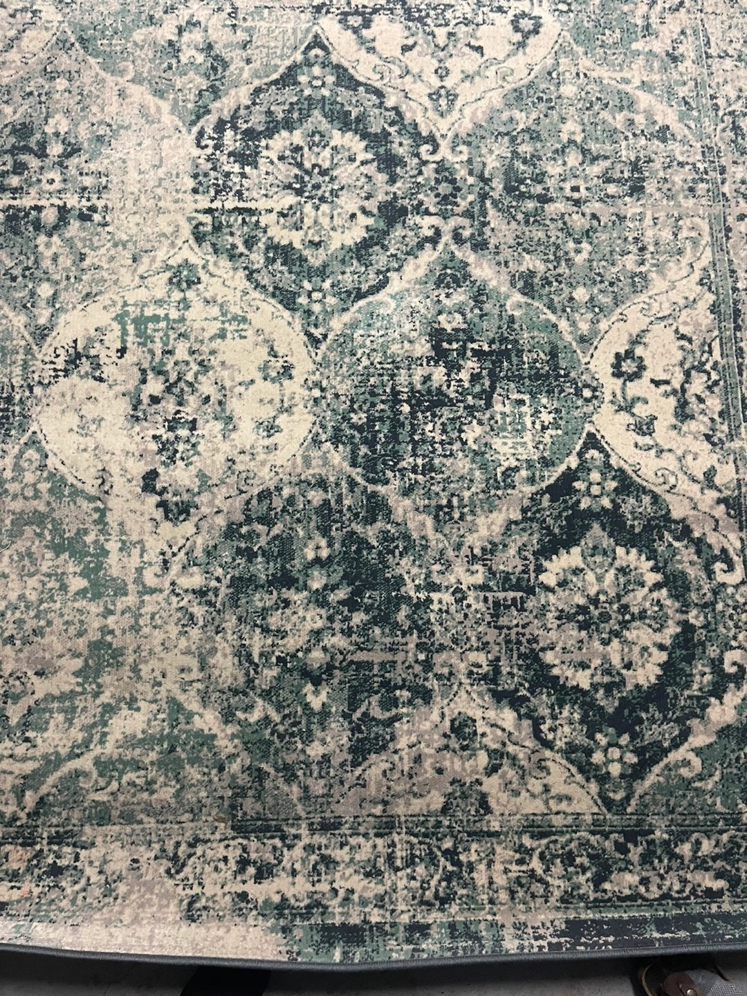 Elegant area rug. Features a distressed design in shades of green and beige. Machine washable.