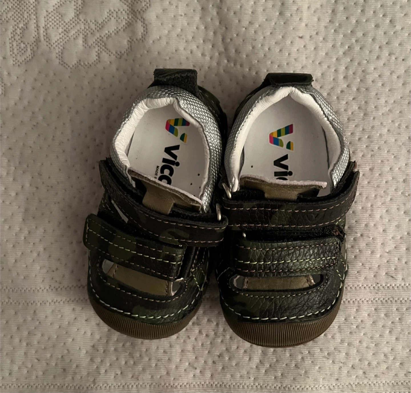 BRAND NEW, COME IN THE BOX. These are Vicco baby shoes in size 19. They feature a camouflage pattern with Velcro straps for easy fastening. The soles are durable and provide good grip. Pick up only