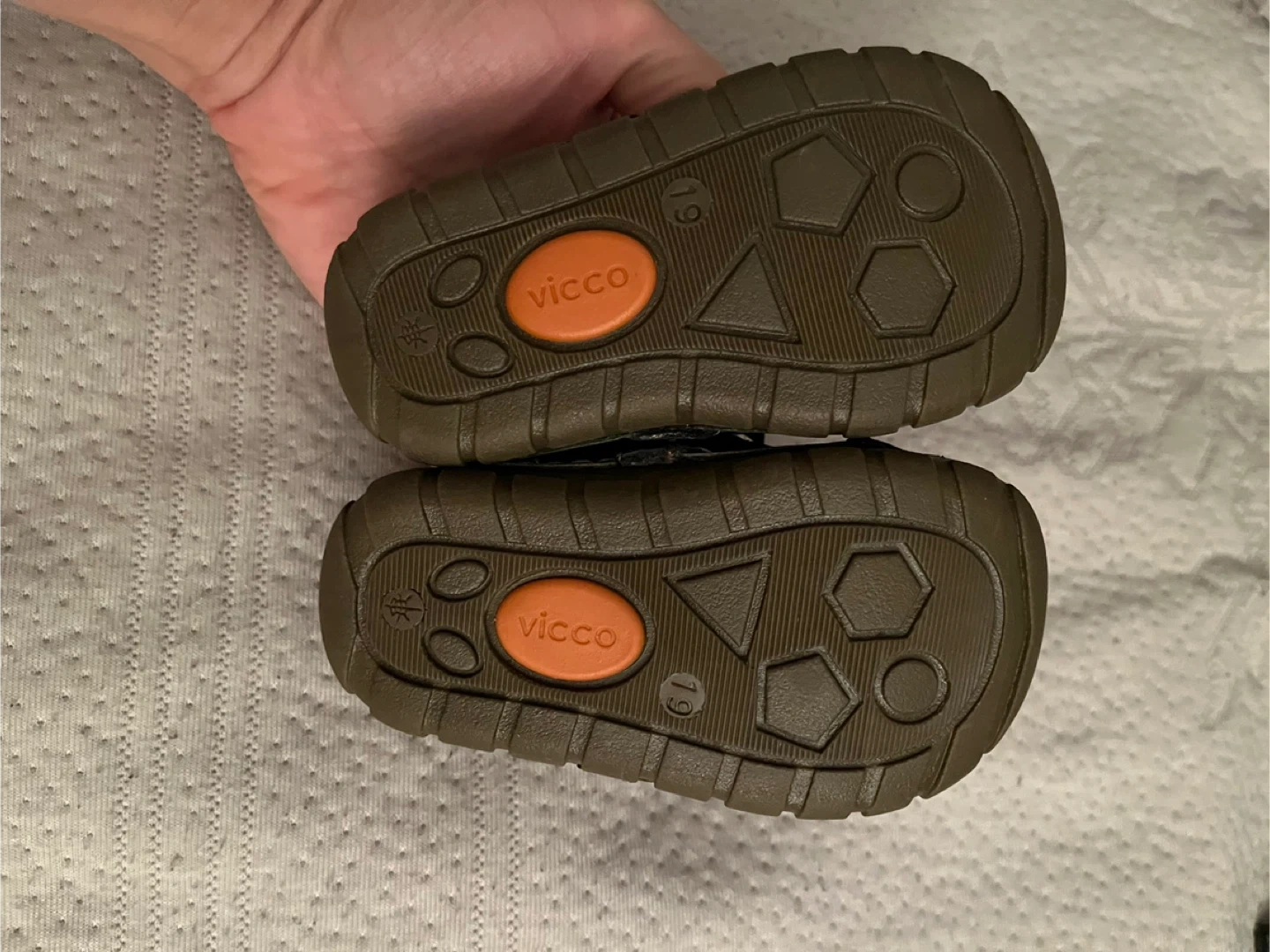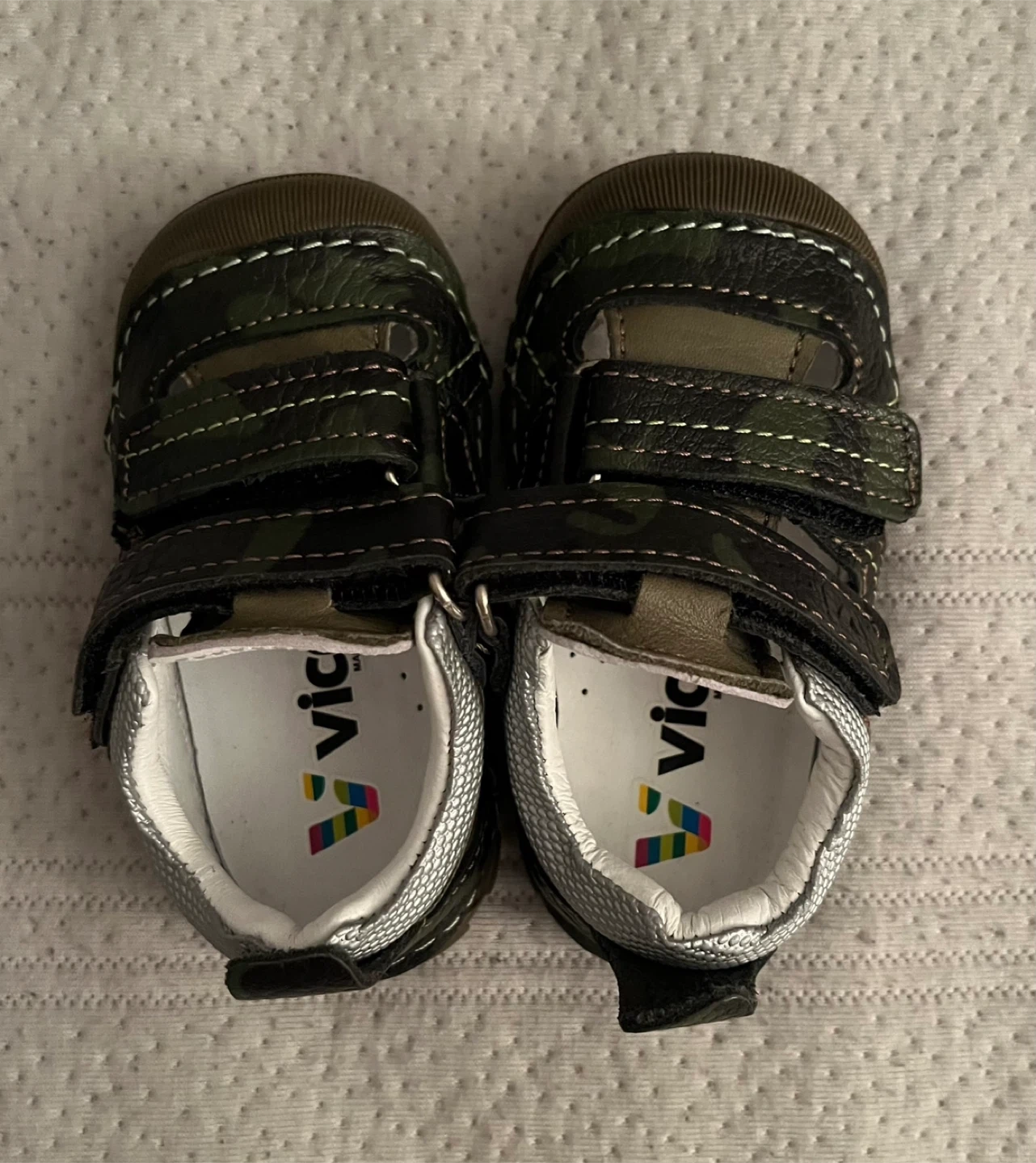 BRAND NEW, COME IN THE BOX. These are Vicco baby shoes in size 19. They feature a camouflage pattern with Velcro straps for easy fastening. The soles are durable and provide good grip. Pick up only