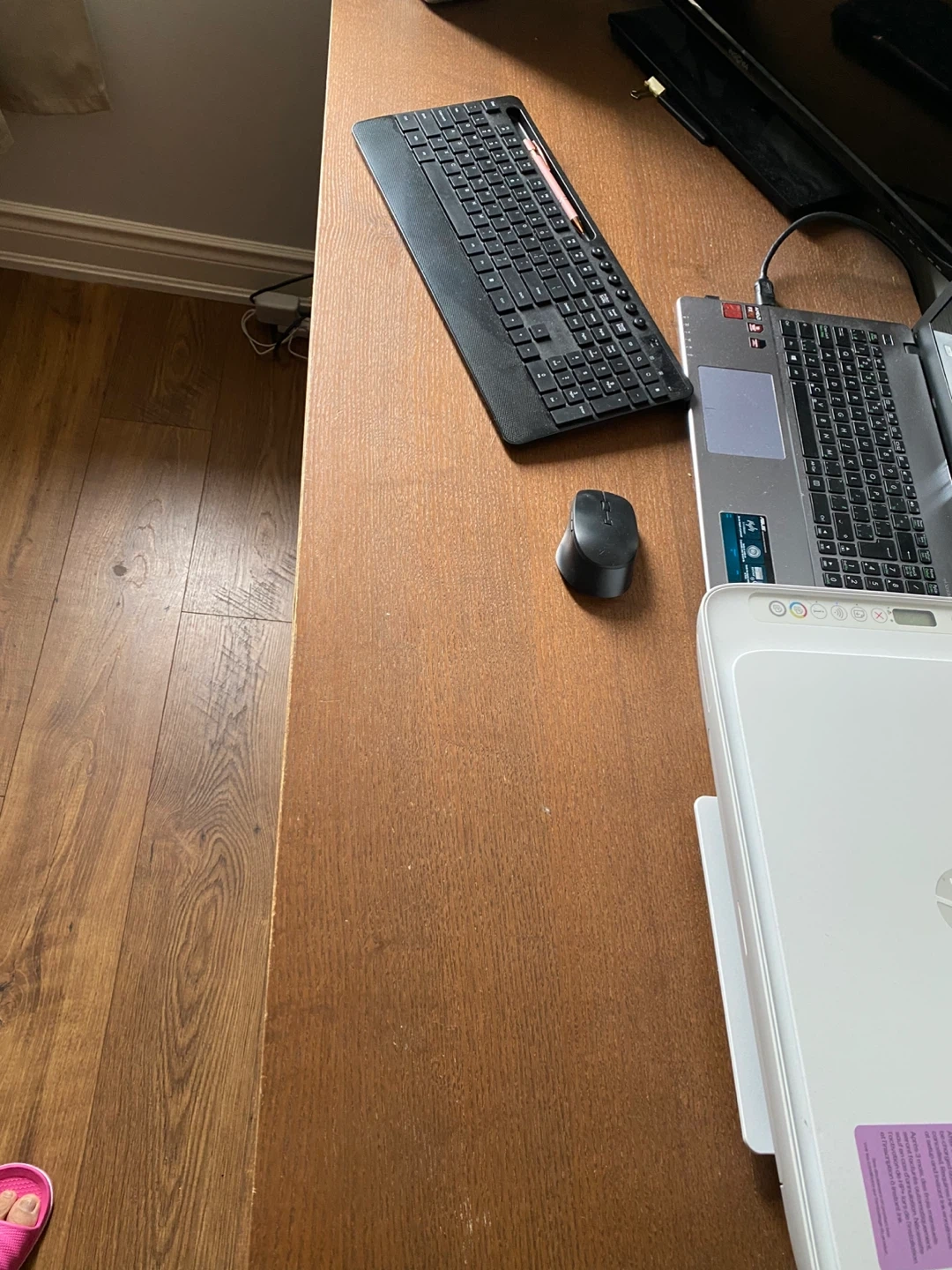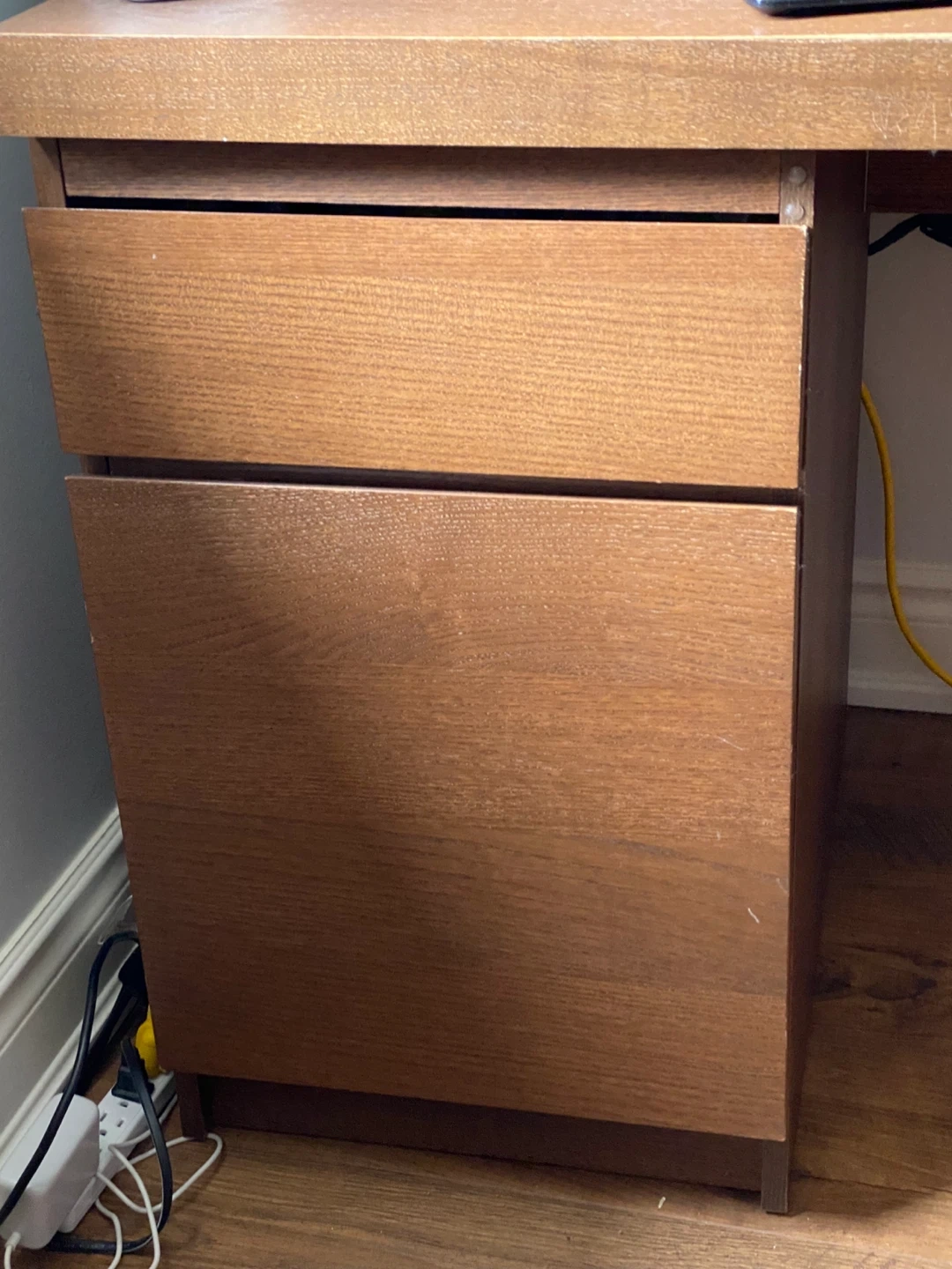This desk features a light brown wood grain finish. It includes two drawers on the left side for storage. It's a solid piece of furniture perfect for a home office.