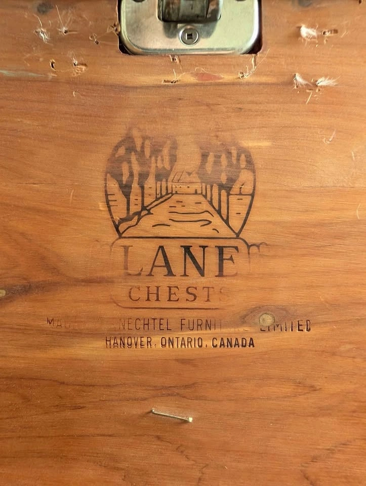 Newly fully restored and saved Lane Cedar Chest. Made by the Knectel Furniture Co Ltd in Hanover Ontario. Serial number 10057. After removing the one dirty cover on top, I uncovered some vintage preserved markings on the walnut lid and kept them. Really unique piece.