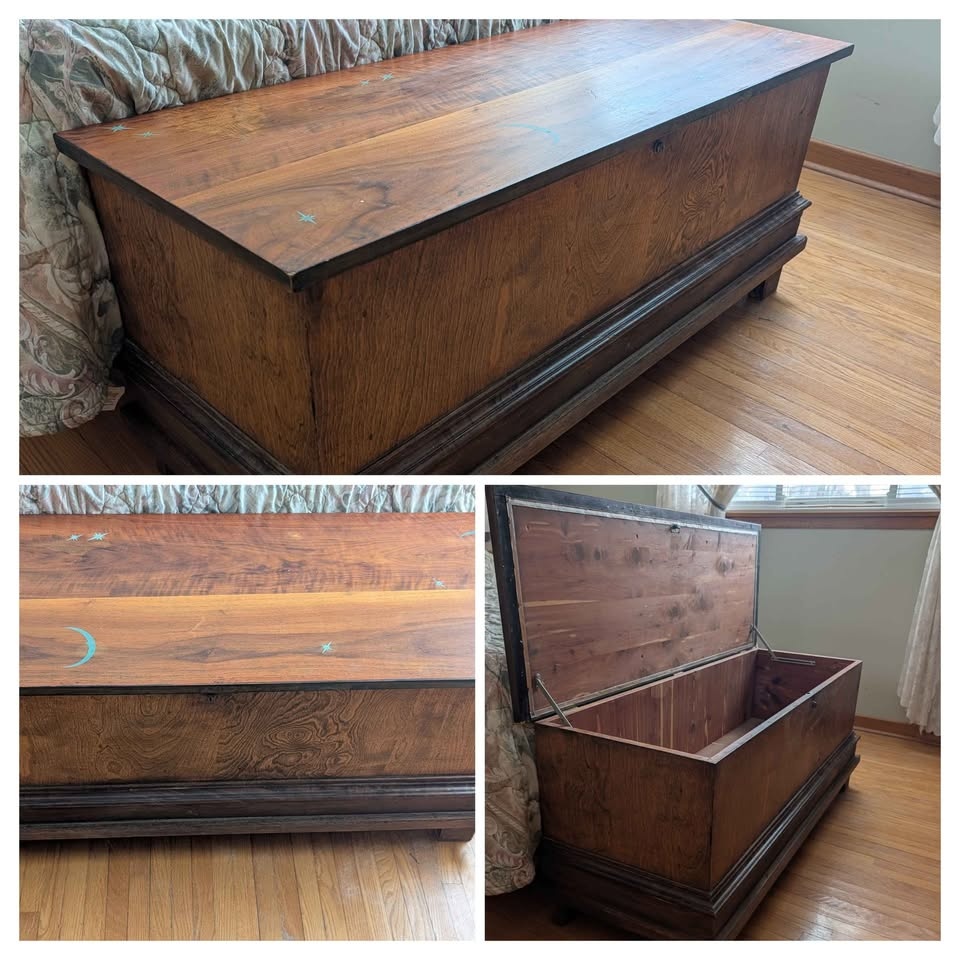 Newly fully restored and saved Lane Cedar Chest. Made by the Knectel Furniture Co Ltd in Hanover Ontario. Serial number 10057. After removing the one dirty cover on top, I uncovered some vintage preserved markings on the walnut lid and kept them. Really unique piece.