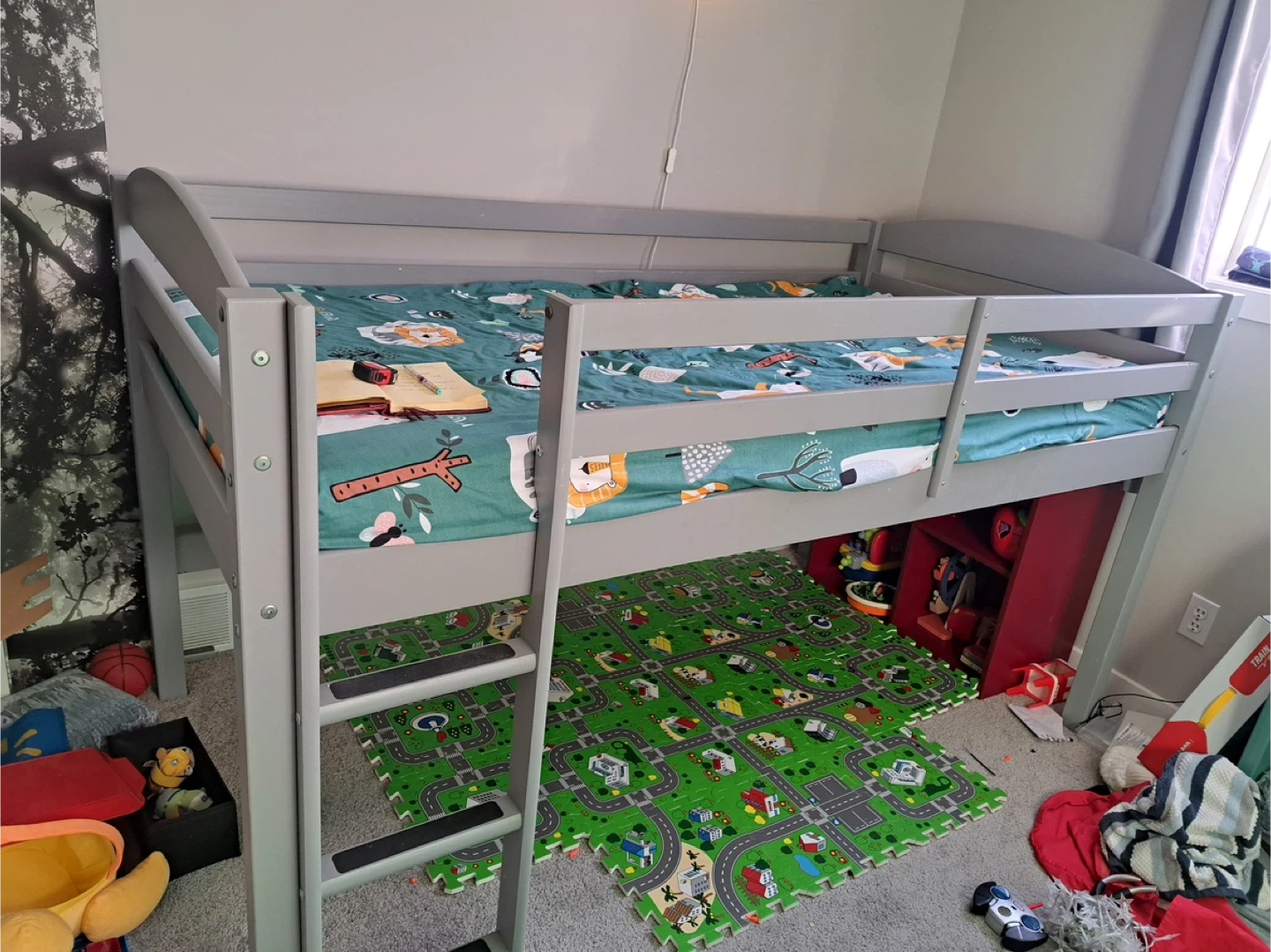 This loft bed frame is a junior loft bed made of grey wood. It's designed for a child's room. The ladder provides easy access to the sleeping area. Lots of space saving. Mattress not included. Twin size.
