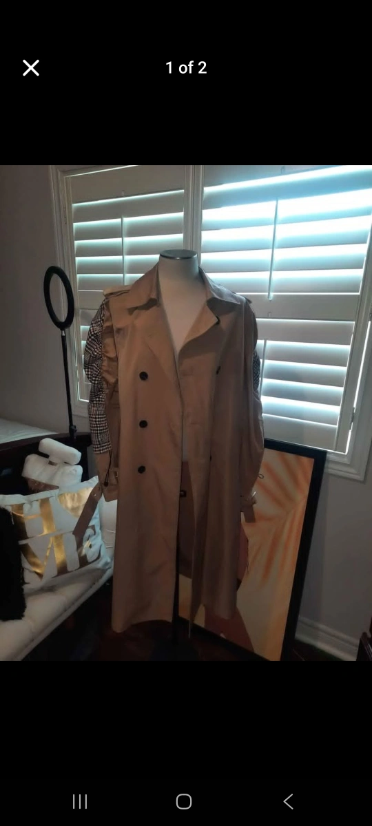 Selling a stylish trench coat in a classic beige colour! It features unique plaid detailing on the sleeves, adding a modern twist to a timeless design. Perfect for layering and adding a touch of sophistication to any outfit