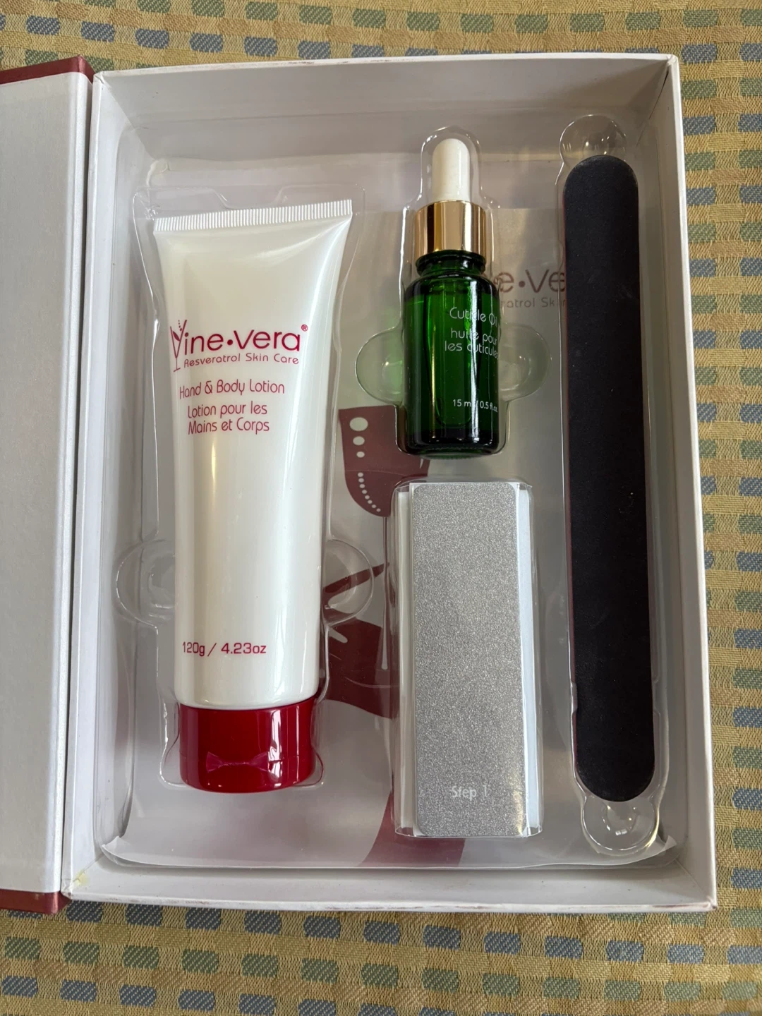 Selling a Vine Vera Resveratrol Skin Care Manicure Exquis Nail Collection Set! Christmas Gift not needed. The set includes a hand and body lotion (120g/4.23oz), cuticle oil (15ml/0.5fl oz), and other manicure tools. The set comes in its original box. Originally bought for $79.00. ASKING:$15.00 Can meet in Calgary as well.
