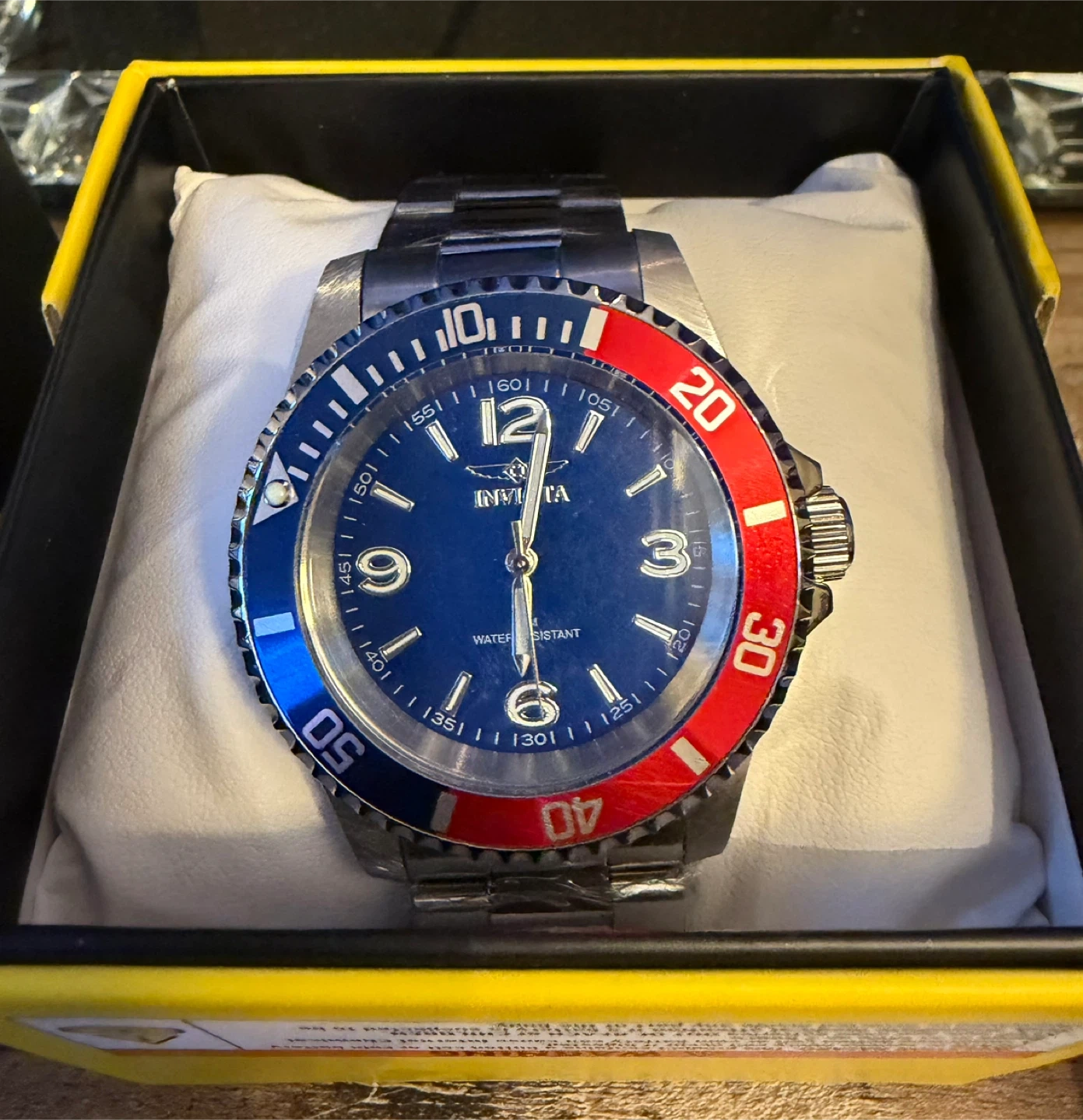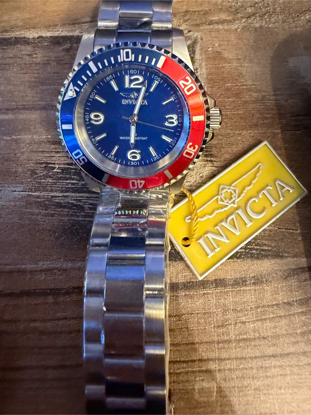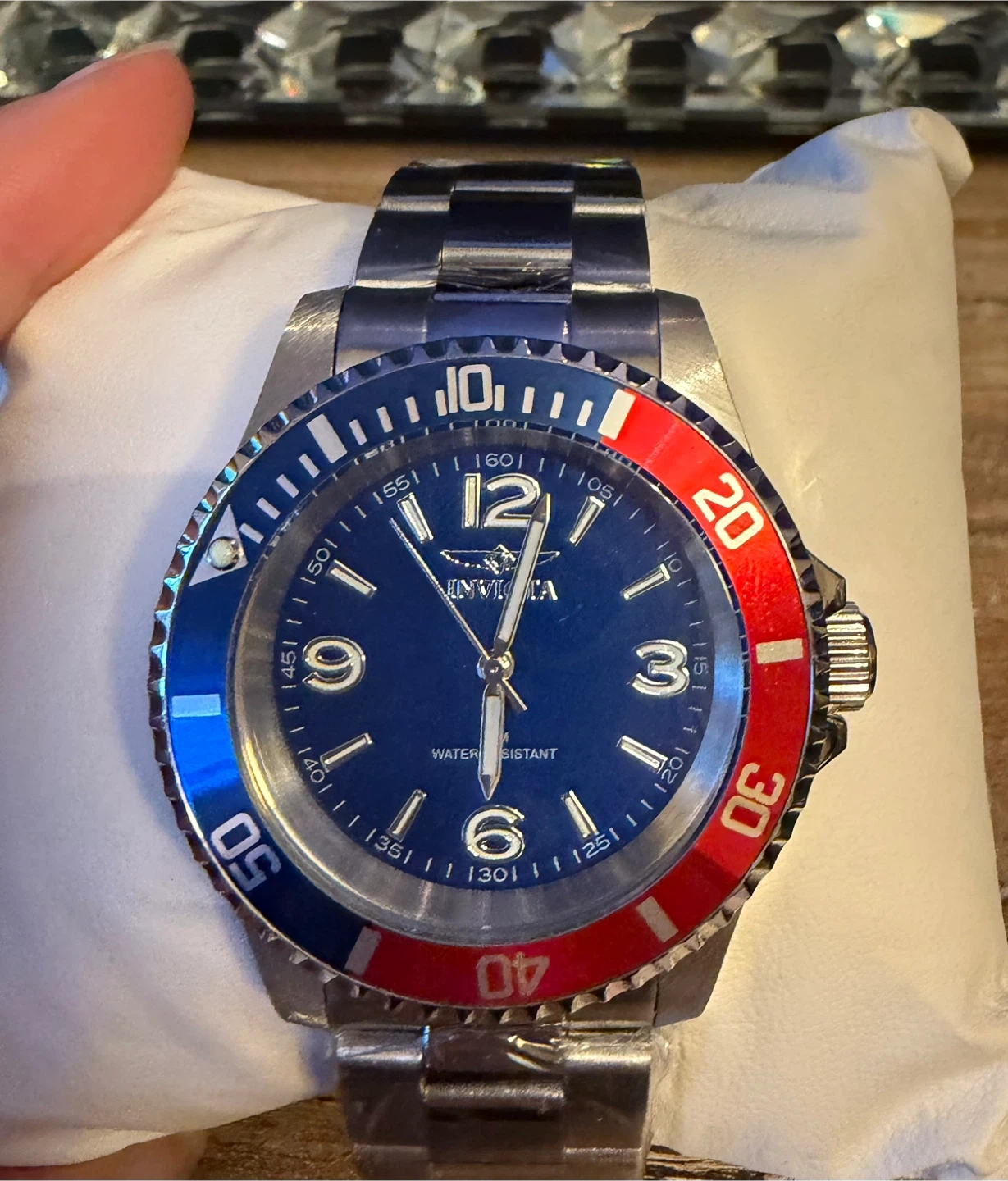 This Invicta Specialty watch features a blue dial and a red and blue rotating bezel. Stainless steel band and case. Water resistant. Brand new .