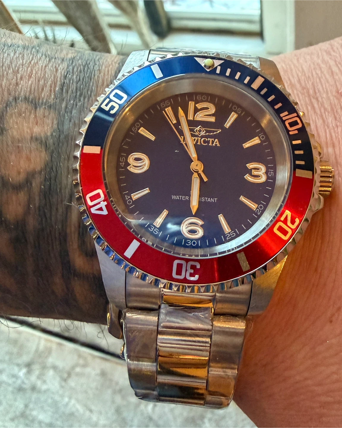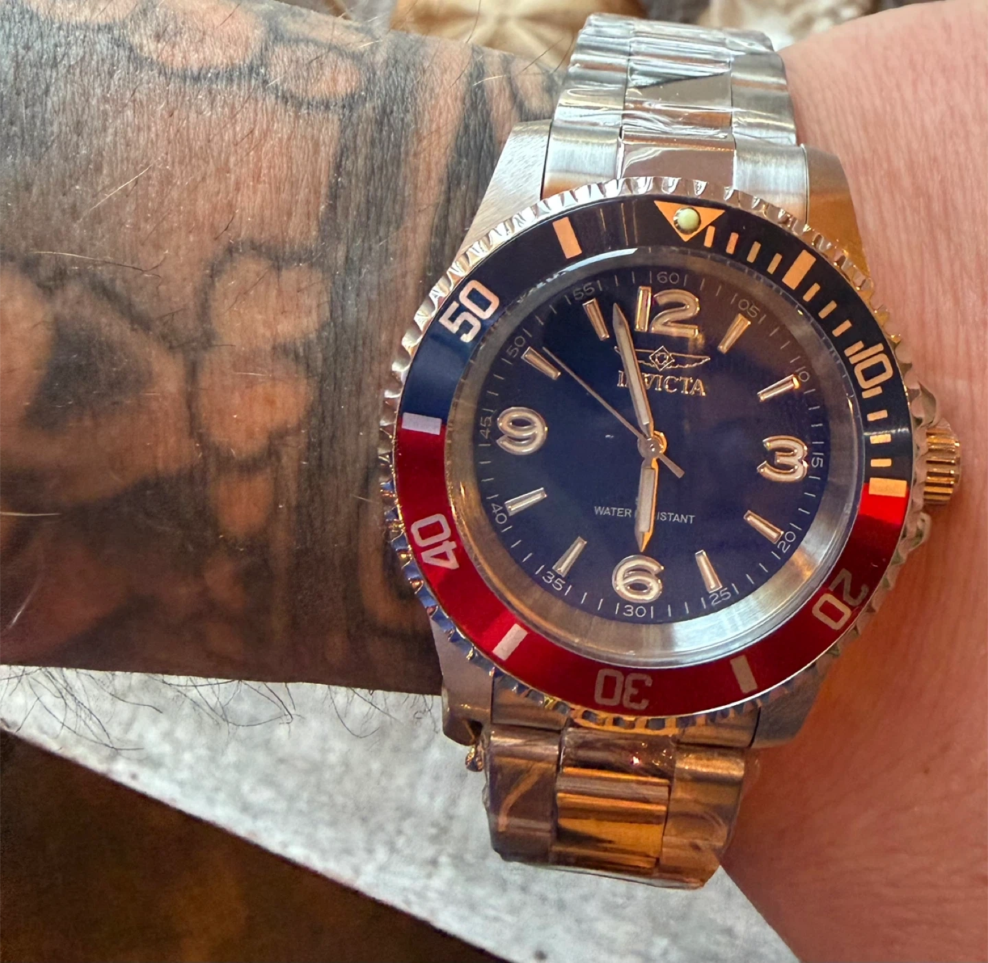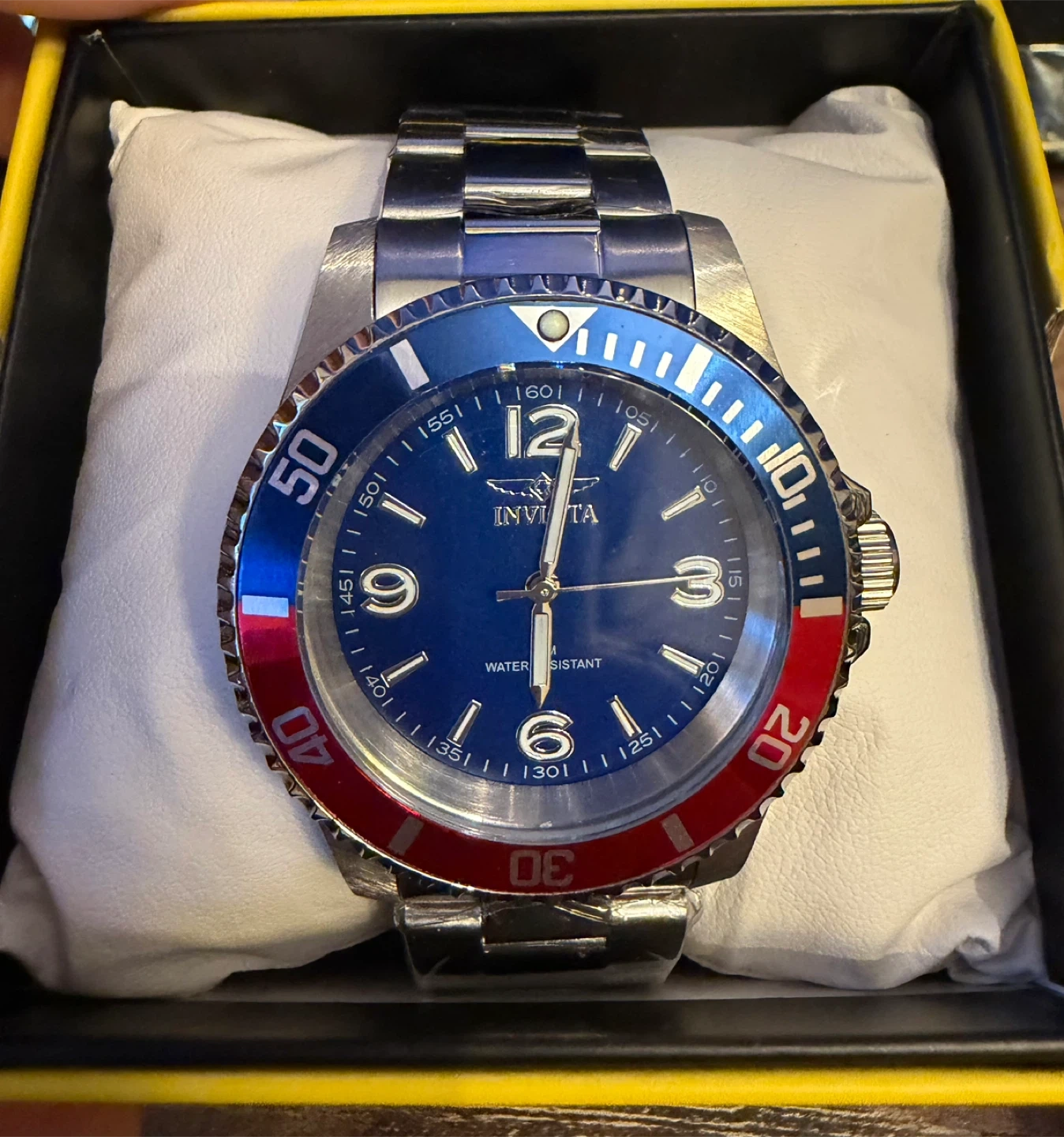 This Invicta Specialty watch features a blue dial and a red and blue rotating bezel. Stainless steel band and case. Water resistant. Brand new .