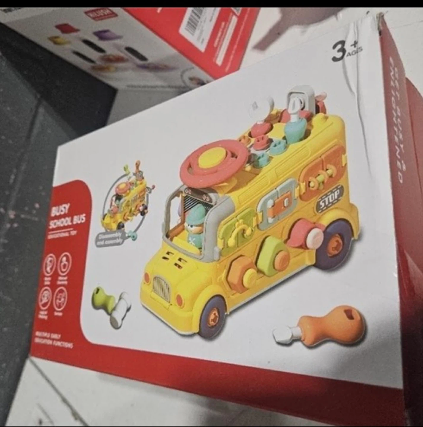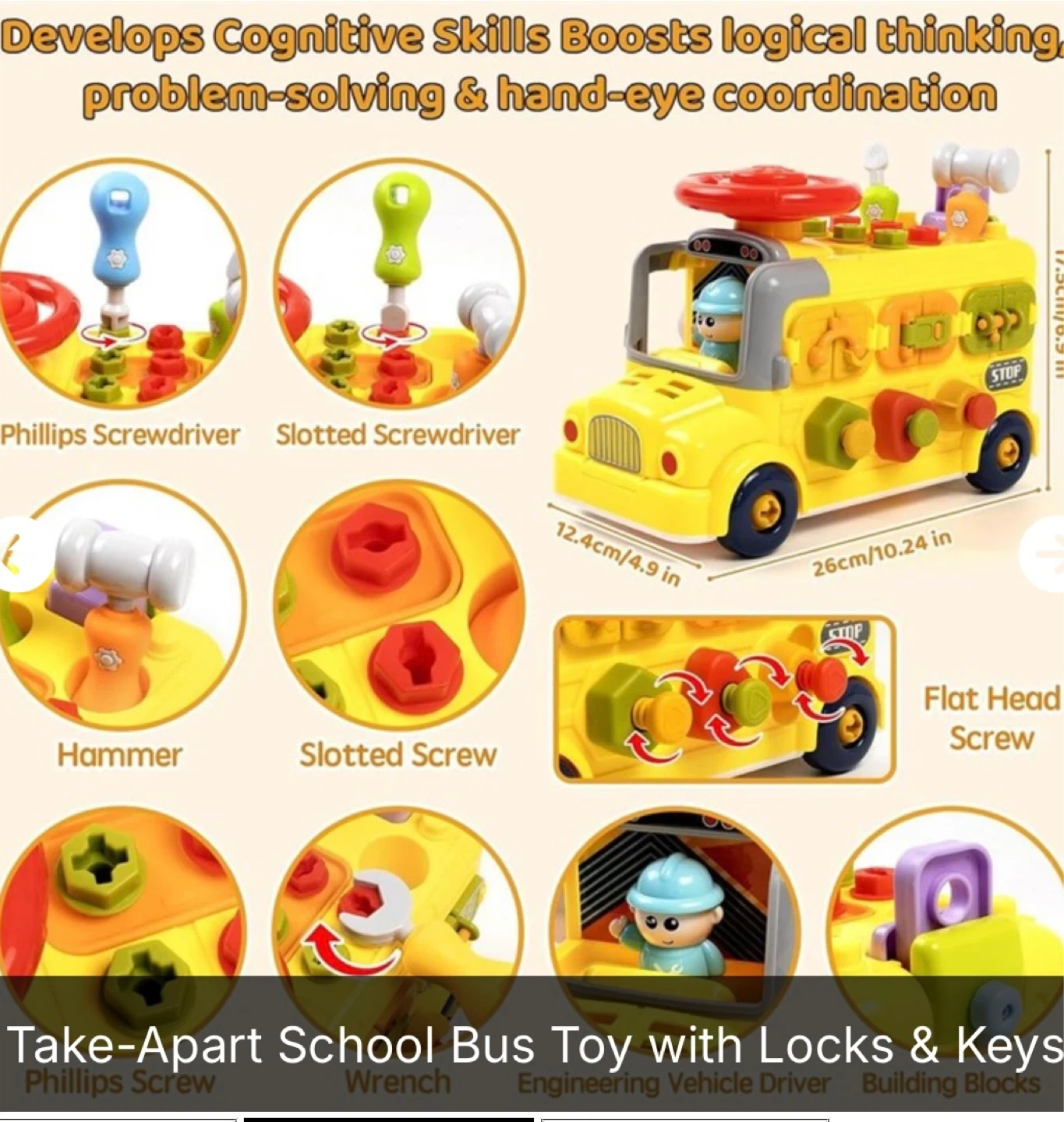 This yellow school bus toy features a take-apart design with screws, nuts, and tools for kids to assemble and disassemble. It includes Phillips and slotted screwdrivers, a hammer, and a wrench, promoting fine motor skills and problem-solving. Recommended for ages 3 and up. Priced to sell close to the border of Brampton and Caledon. - Kennedy and Mayfield is the main intersection.