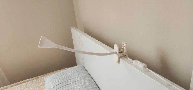 Illuminate your space with this white Ikea Navlinge LED clamp spotlight, perfect for desks, bedside tables, or anywhere you need focused light. This used lamp is in good condition and ready to brighten your day. Specifications: