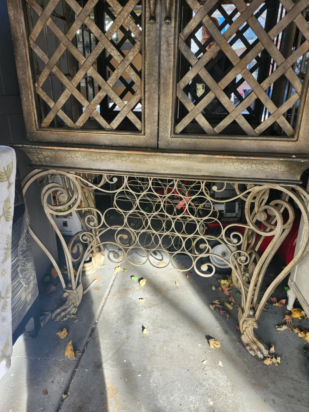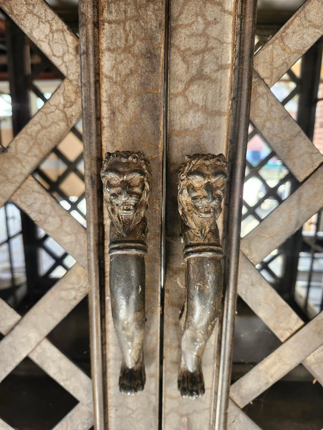 It features a lattice-style door design and a decorative wine rack base. The cabinet has ornate lion head handles, adding a touch of character. It's a beautiful piece to showcase your items and store your wine collection