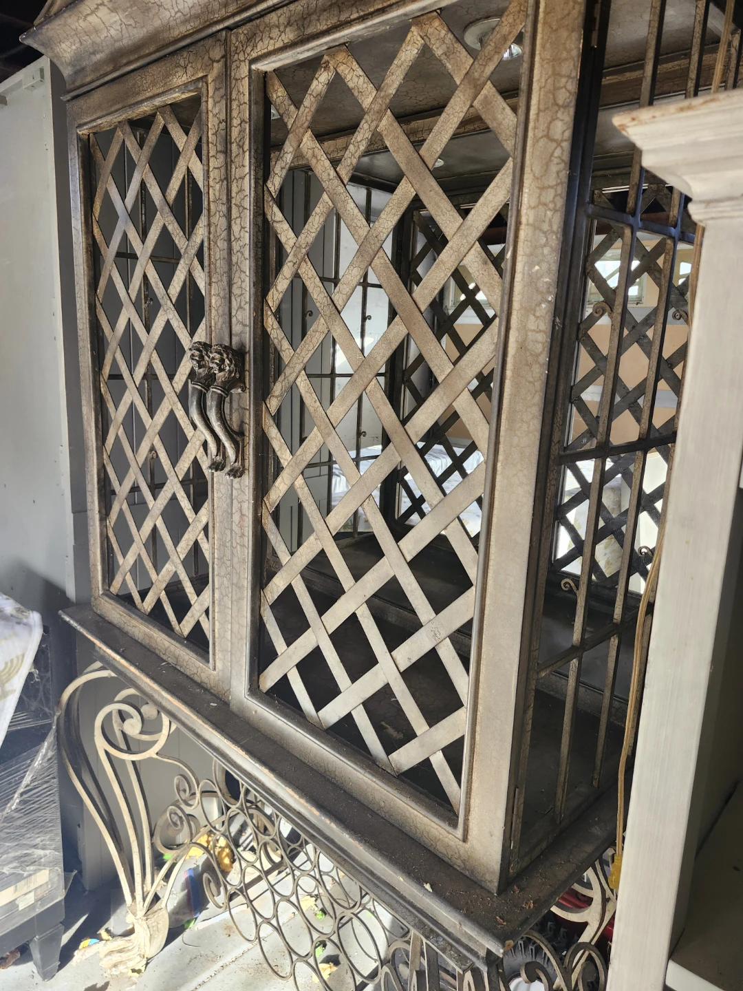 It features a lattice-style door design and a decorative wine rack base. The cabinet has ornate lion head handles, adding a touch of character. It's a beautiful piece to showcase your items and store your wine collection