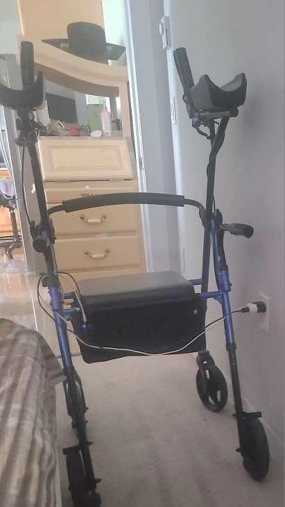 I'm selling a blue upright walker with a seat. It appears to be in good condition and ready to help someone get around more easily