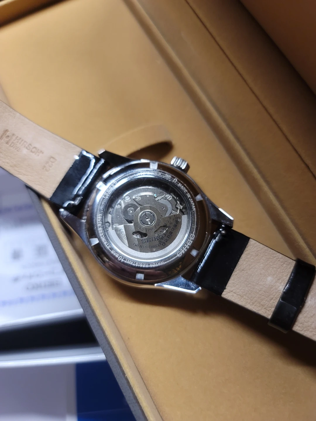 Seiko Presage Automatic watch with a black dial and leather strap. It's an automatic movement watch with an exhibition case back. Comes with original box and warranty papers.