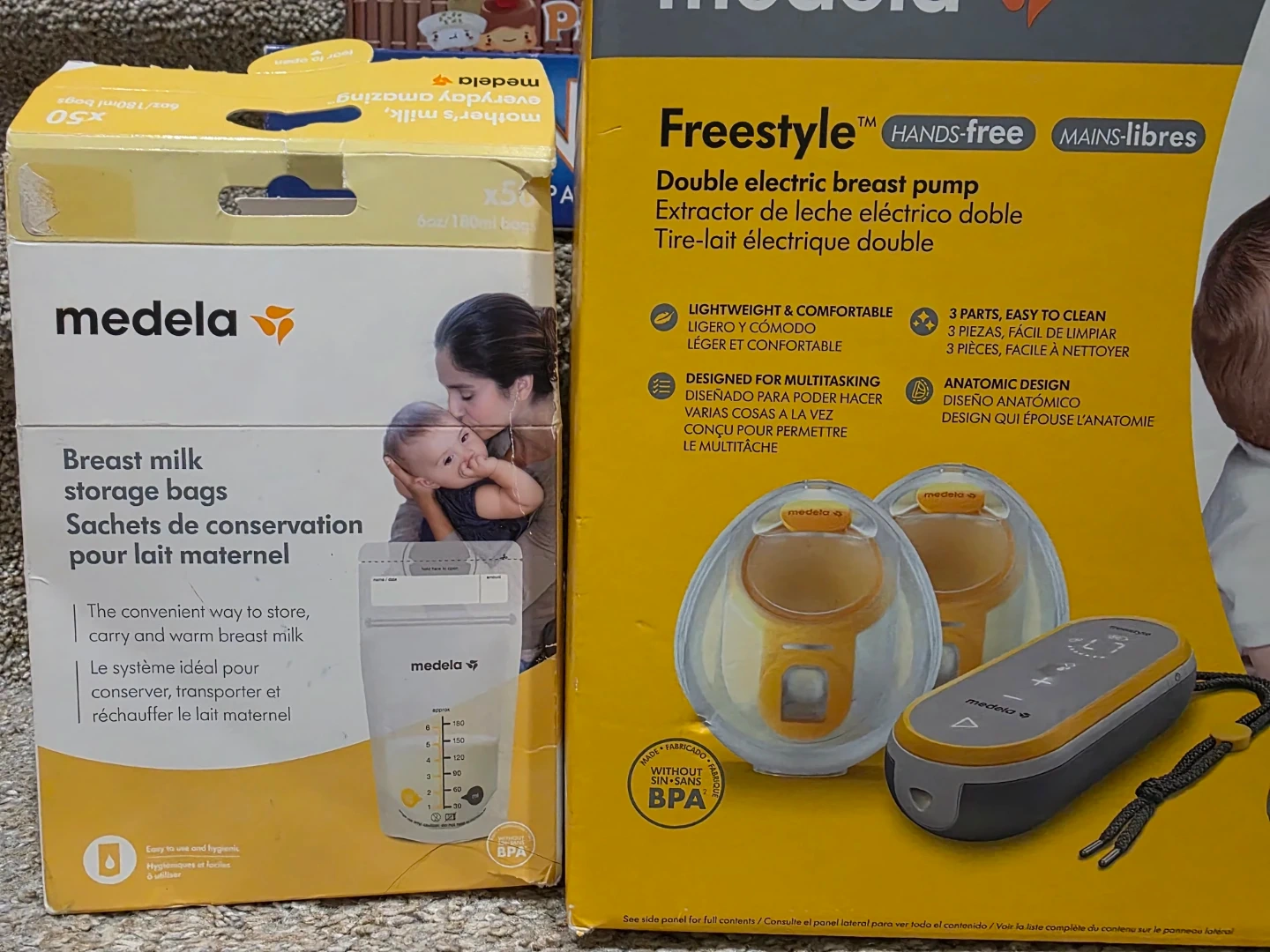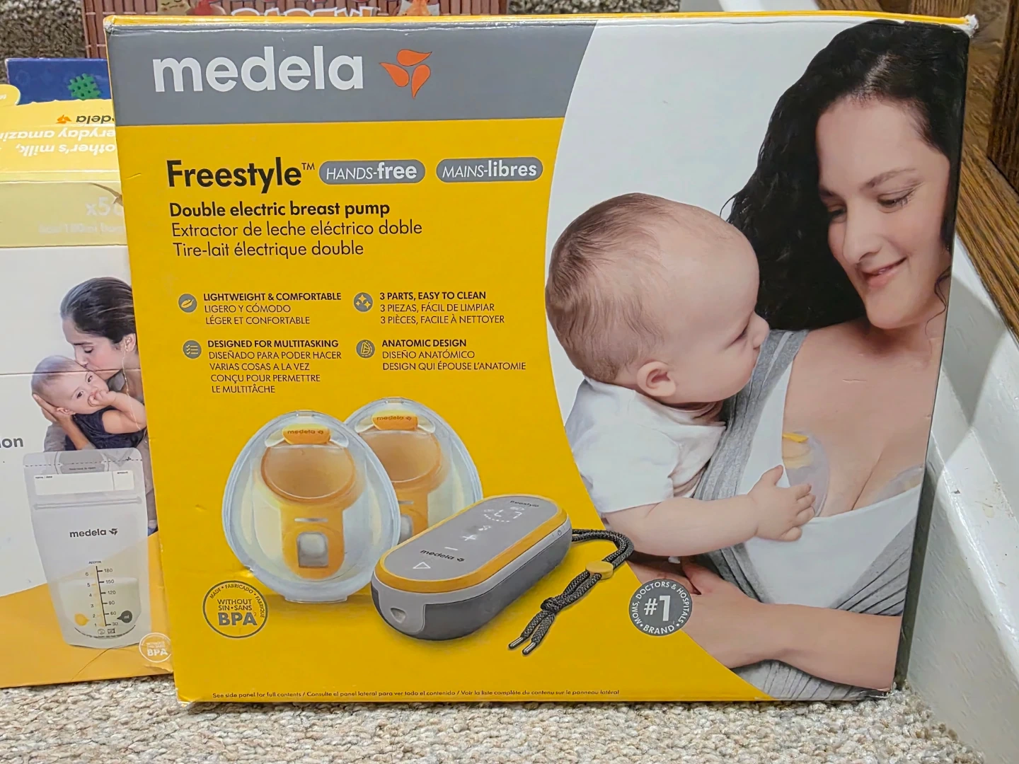 Medela Freestyle double electric breast pump for hands-free operation. It's lightweight and comfortable, designed for multitasking. The pump features 3 easy-to-clean parts and an anatomic design.