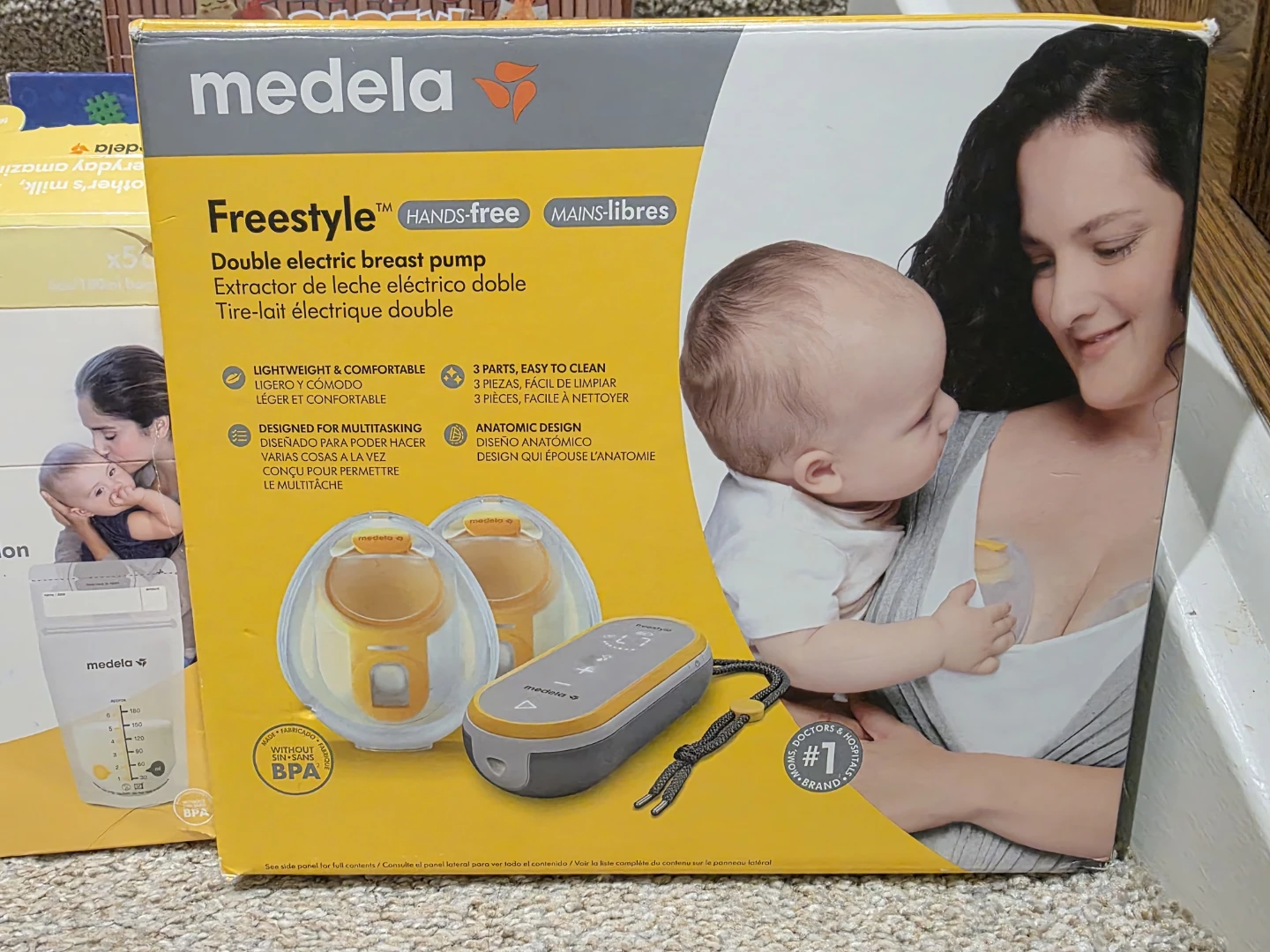 Medela Freestyle double electric breast pump for hands-free operation. It's lightweight and comfortable, designed for multitasking. The pump features 3 easy-to-clean parts and an anatomic design.