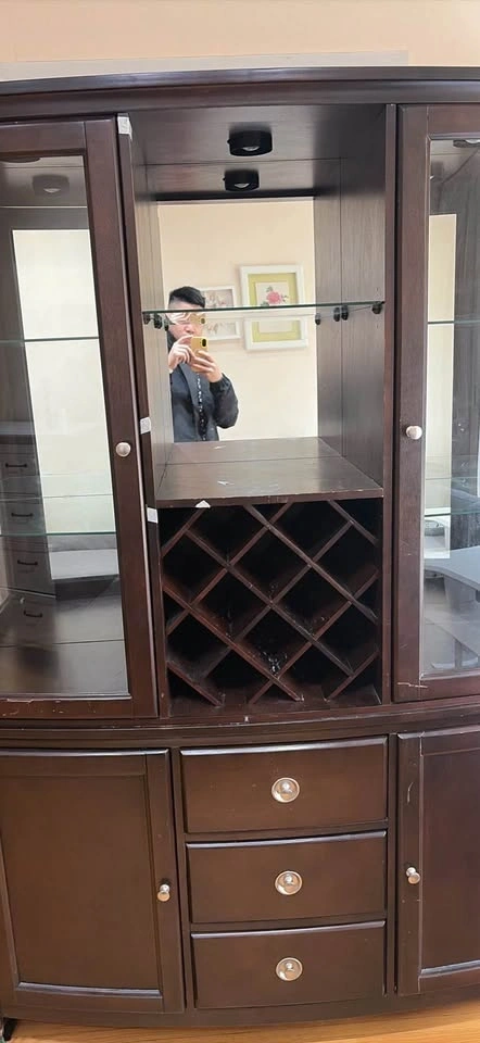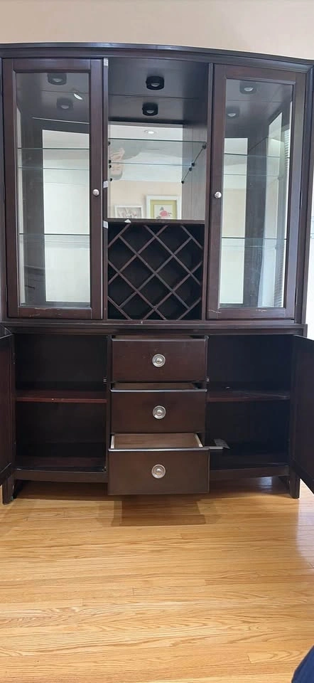 Sturdy dark wood hutch with integrated wine rack and mirrored back panel. Upper section includes two glass-front cabinets with glass shelving and overhead lighting. Lower base provides three center drawers and two side cabinets for additional storage. Silver-tone hardware accents the espresso finish.