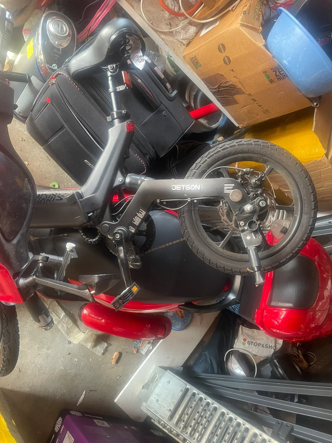 This is a Jetson folding electric bike. It features a red frame and black accents. It's designed for convenient urban commuting.
