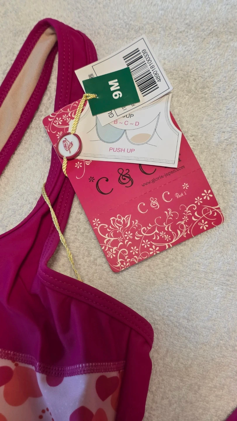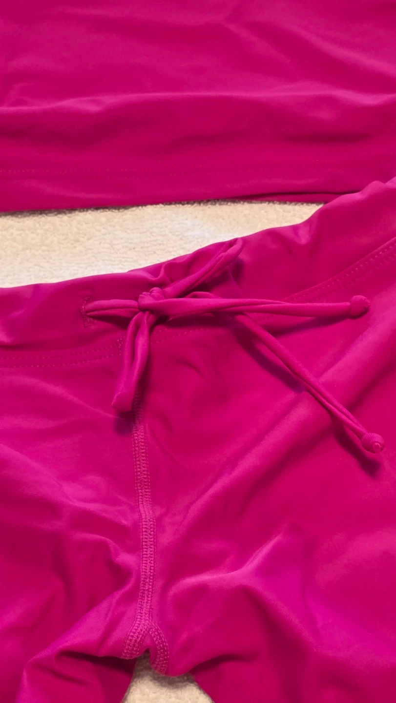 This C&C California swim set features a pink tankini top with a cute heart print across the bust. It's paired with matching pink bottoms that have a drawstring waist. It's perfect for a day at the beach or pool!