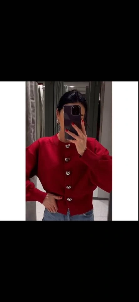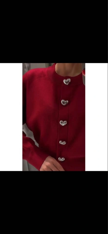 Beautiful red knit cardigan featuring unique silver heart-shaped buttons. Soft, comfortable fabric with a slightly cropped fit and subtle puff sleeves for a flattering silhouette. Perfect for casual wear, work outfits, or dressing up with jeans or skirts.
