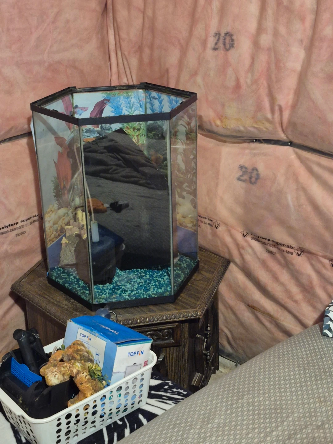 This is a hexagonal glass aquarium tank. It includes gravel, a filter, and some decorative elements. It's suitable for small fish or as a starter tank. Comes with a year worth of filters and everything you need just add water and fish. 150 or shoot me an offer