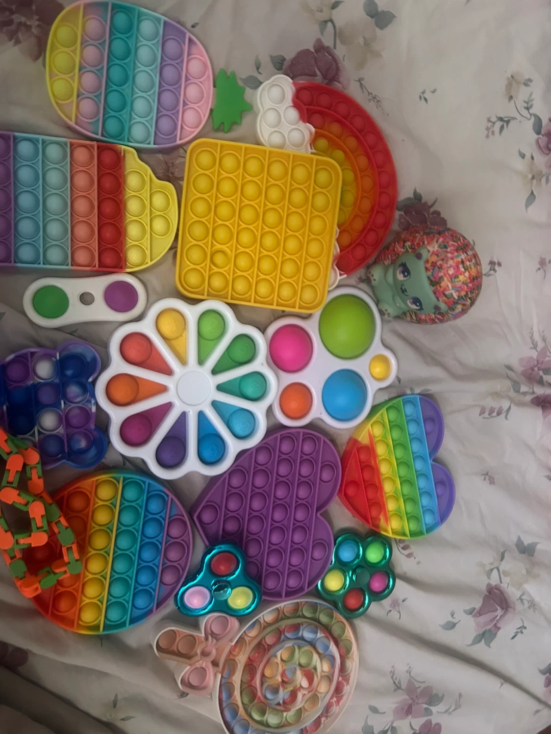 This is a collection of various pop-it and fidget toys. Includes multiple shapes like hearts, circles, and ice cream pops. Made of silicone and plastic materials.