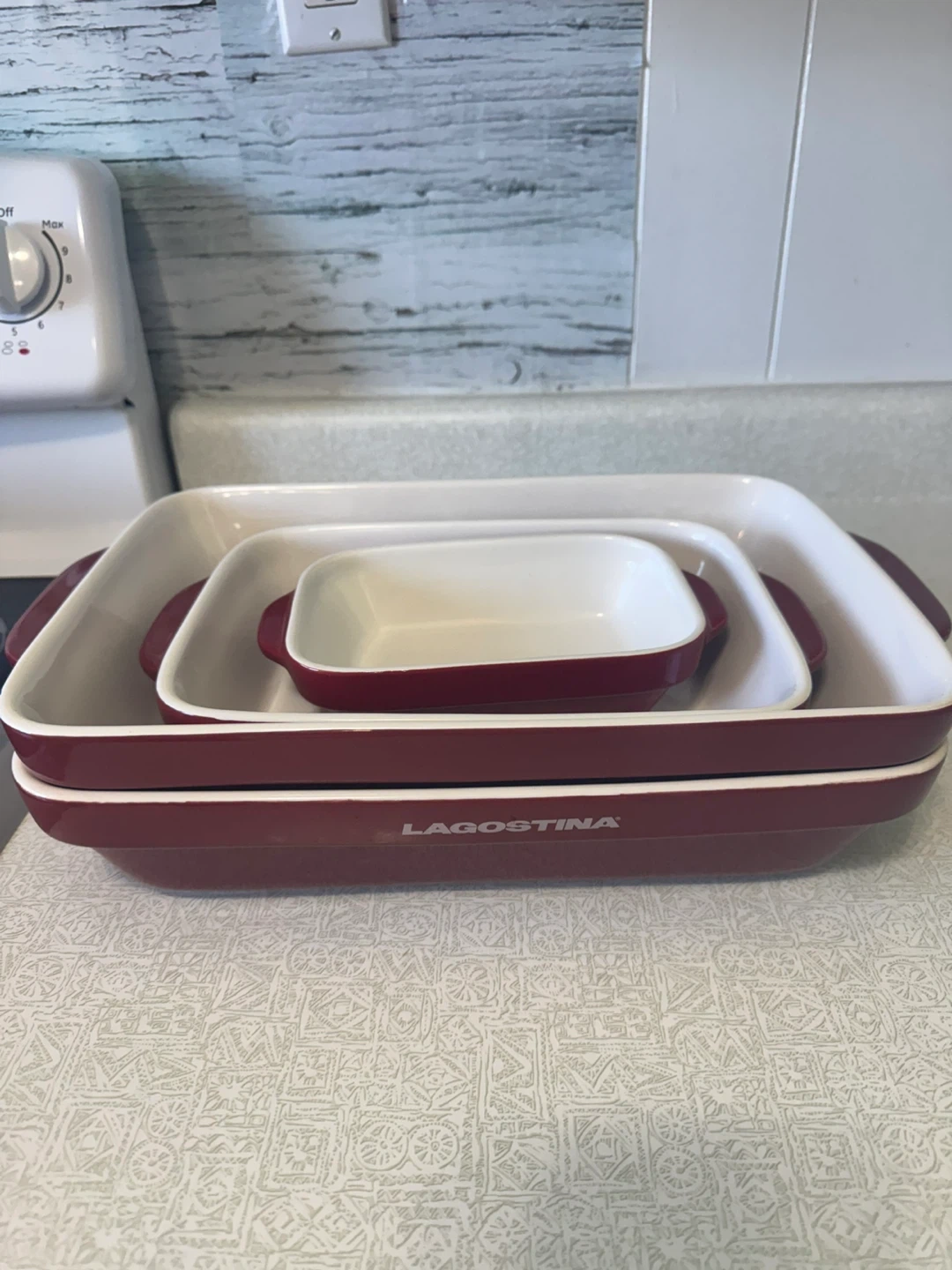 This set includes three nesting ceramic baking dishes from Lagostina. Features a classic white interior with a deep red exterior. Oven-safe ceramic construction.