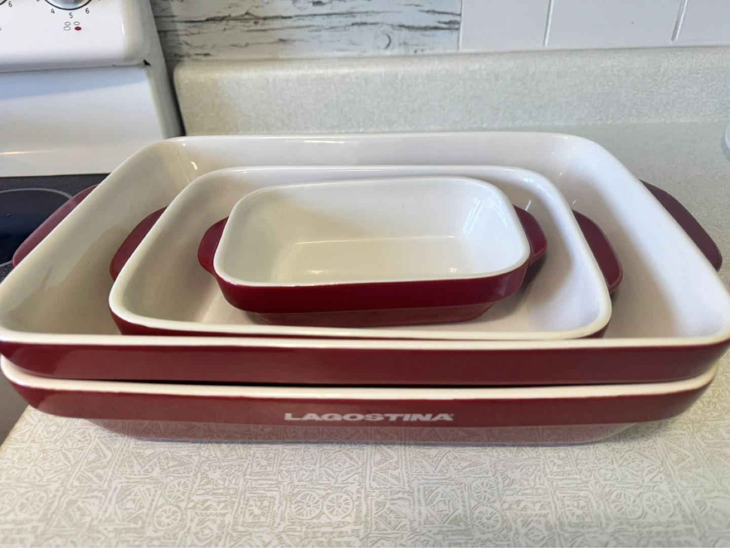 This set includes three nesting ceramic baking dishes from Lagostina. Features a classic white interior with a deep red exterior. Oven-safe ceramic construction.