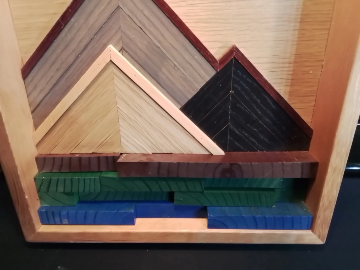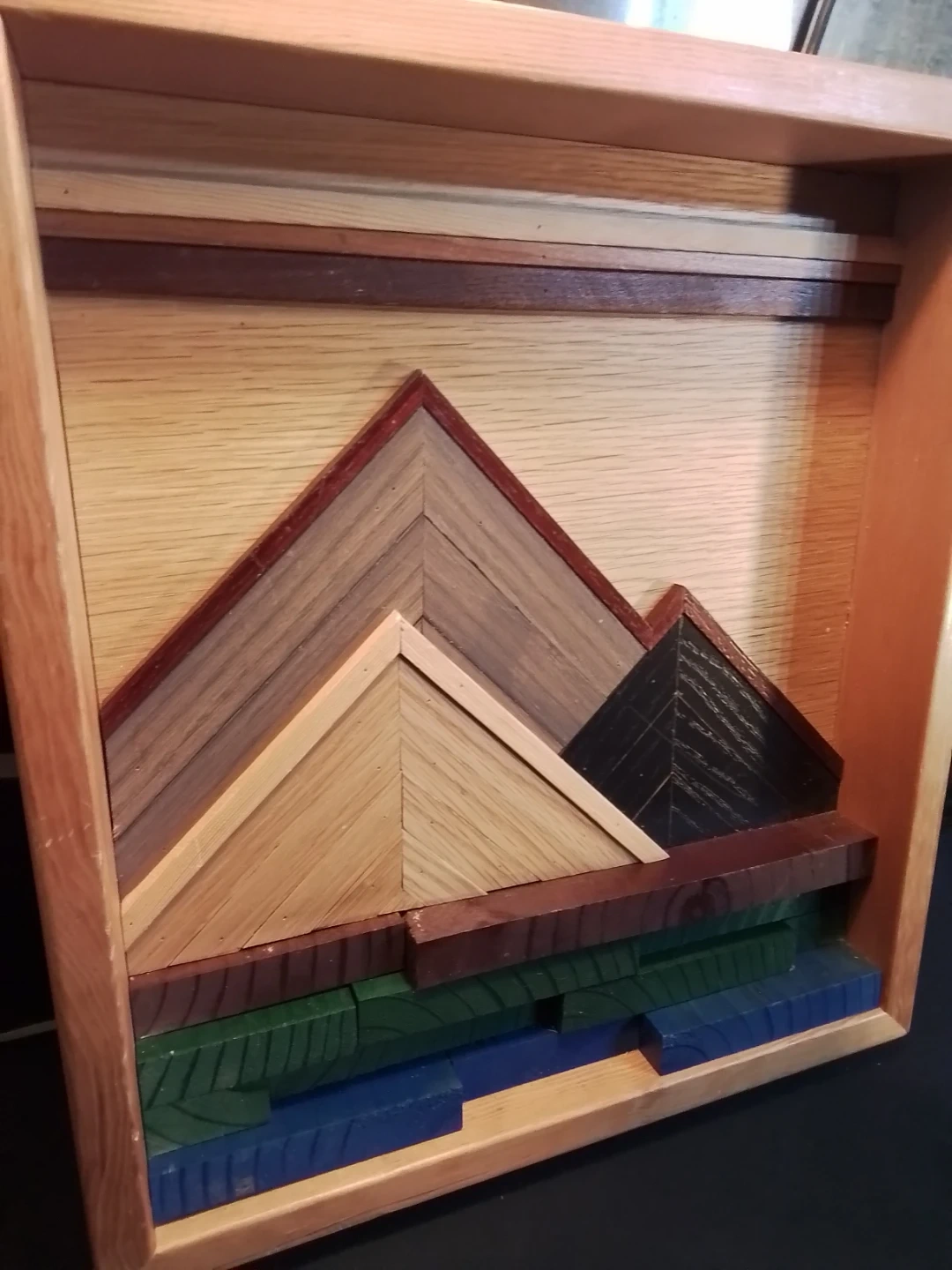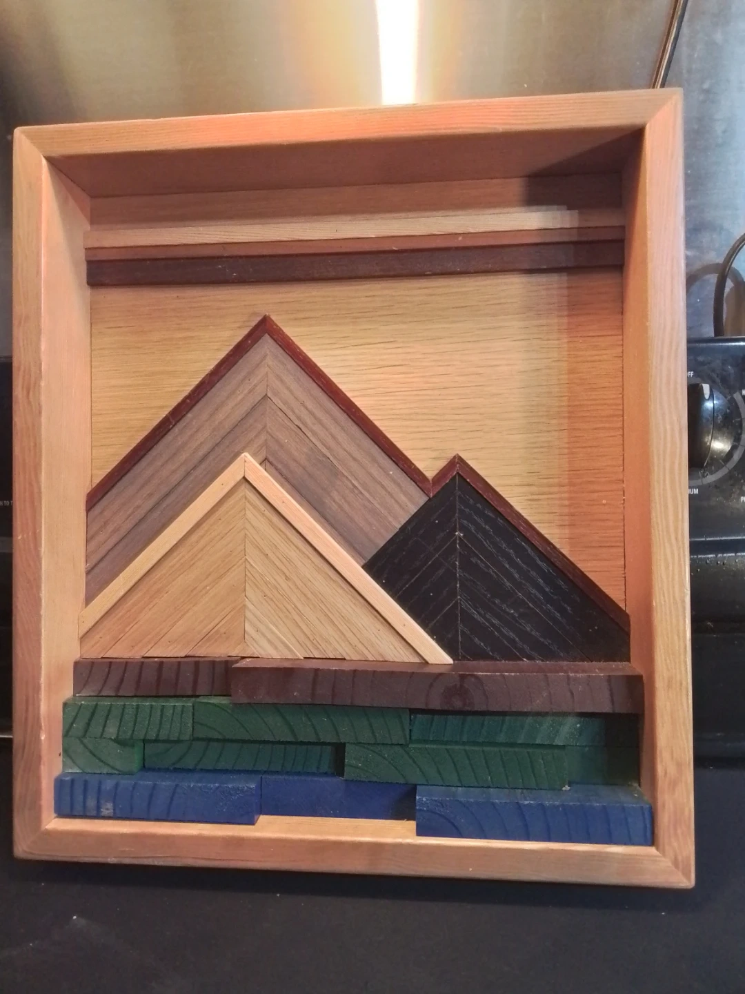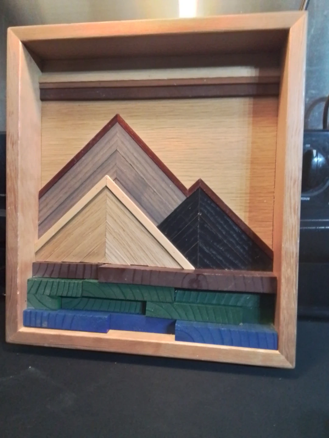 This striking piece of geometric solid wood mosaic wall art is sure to capture attention with its unique mountain landscape design, measuring 15.5x13.5 inches and boasting a substantial weight, giving it a premium feel. Due to being a used item, there may be slight signs of wear, which only add to its unique character.