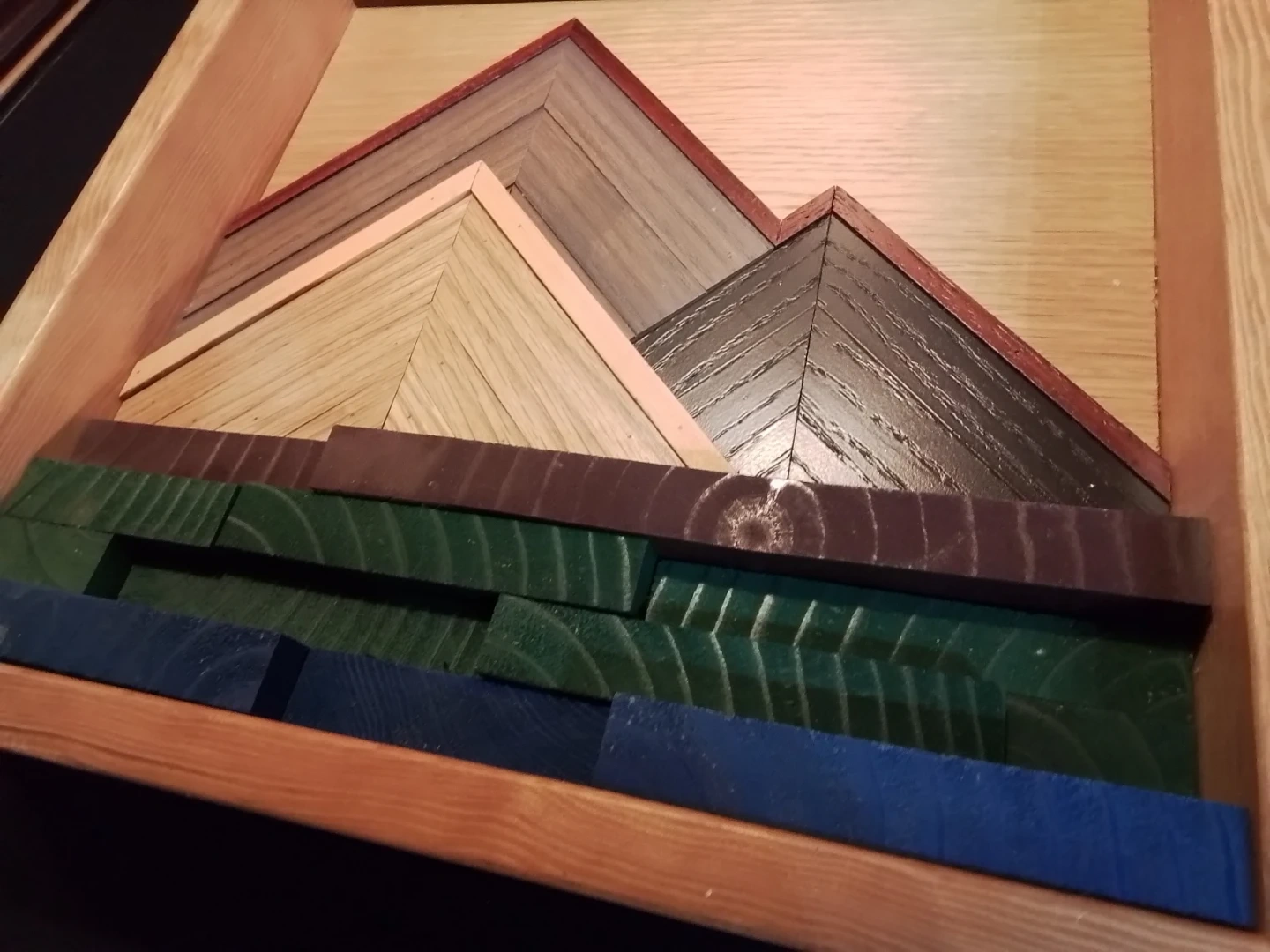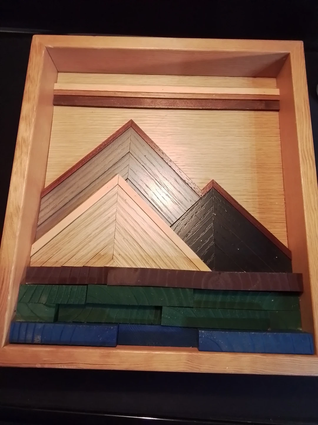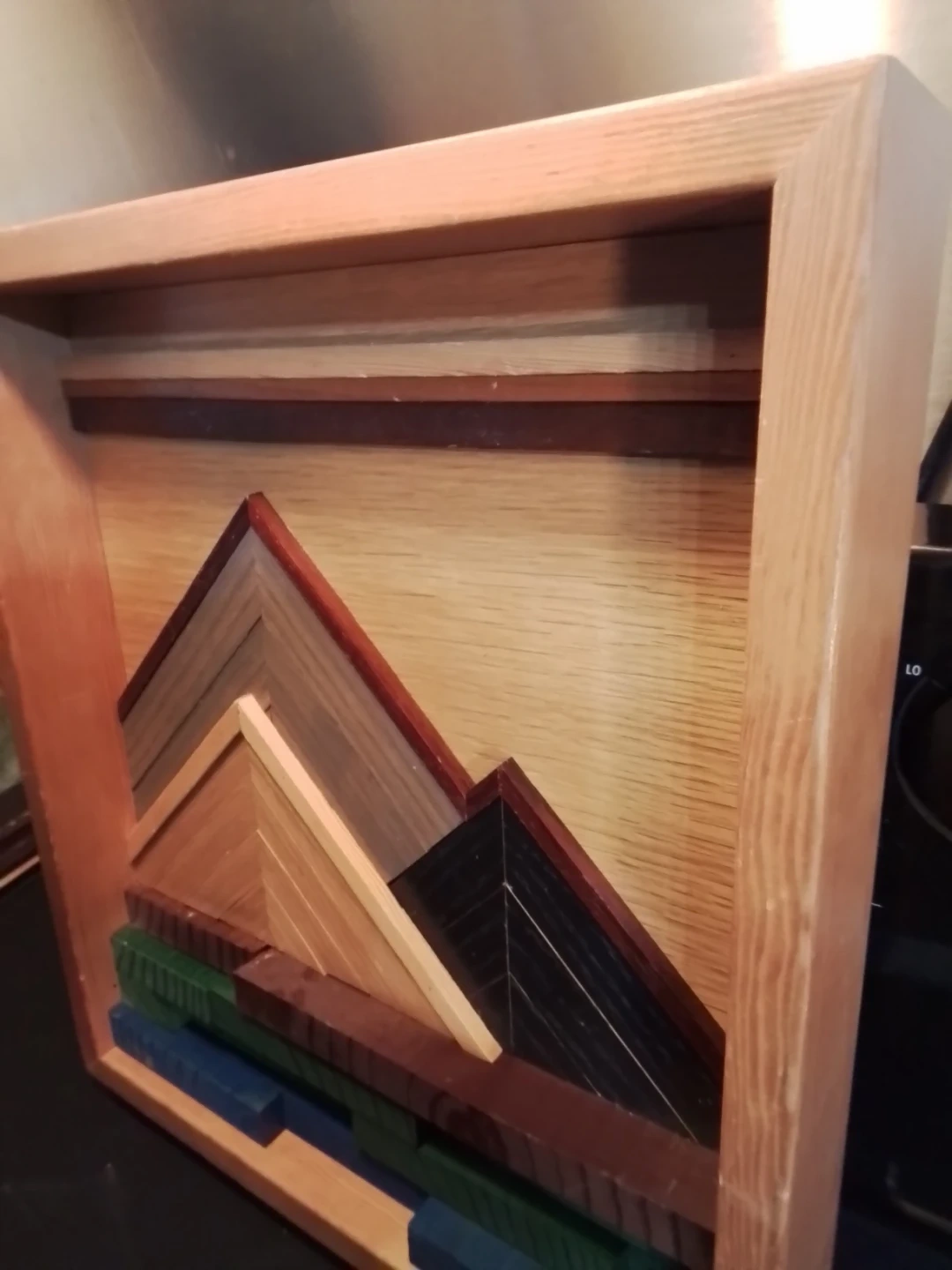 This handcrafted artwork features a harmonious blend of various wood types and colors, creating a captivating visual texture that is both modern and rustic.