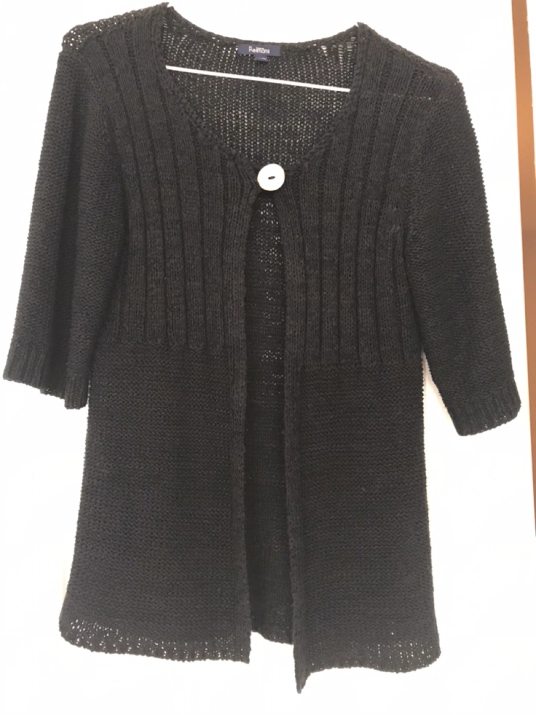 Black knit cardigan, half-sleeves, one button. Open front. Relaxed fit. I think it fit more Size S than XS. Worn only couple of times. Excellent condition.