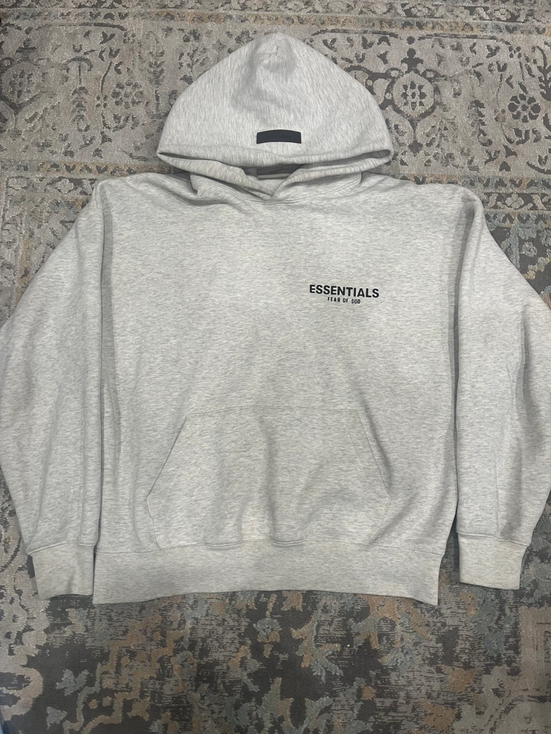 ESSENTIALS by Fear of God grey hoodie. It's a pullover style with a front pocket. Made from a soft cotton blend.
