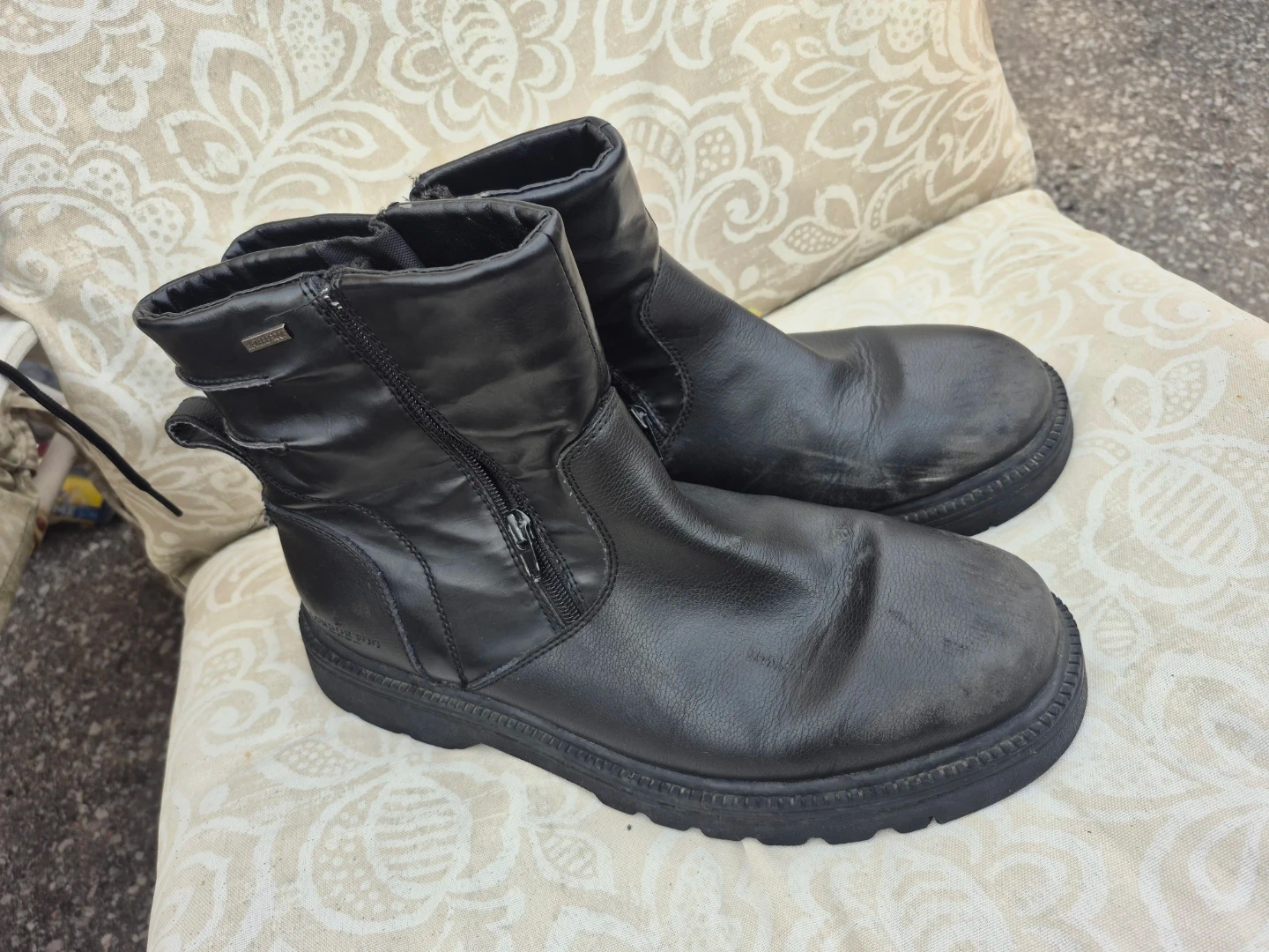 These black winter boots feature Gore-Tex for waterproofing. They have side zippers for easy on and off. Great for keeping your feet dry and warm during colder weather!
