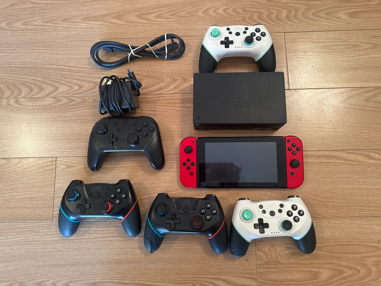 Selling a Nintendo Switch console with a variety of controllers! Includes the original console, dock, and power adapter. There's also a black Nintendo Pro Controller and several third-party controllers to share the fun with friends and family!