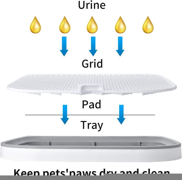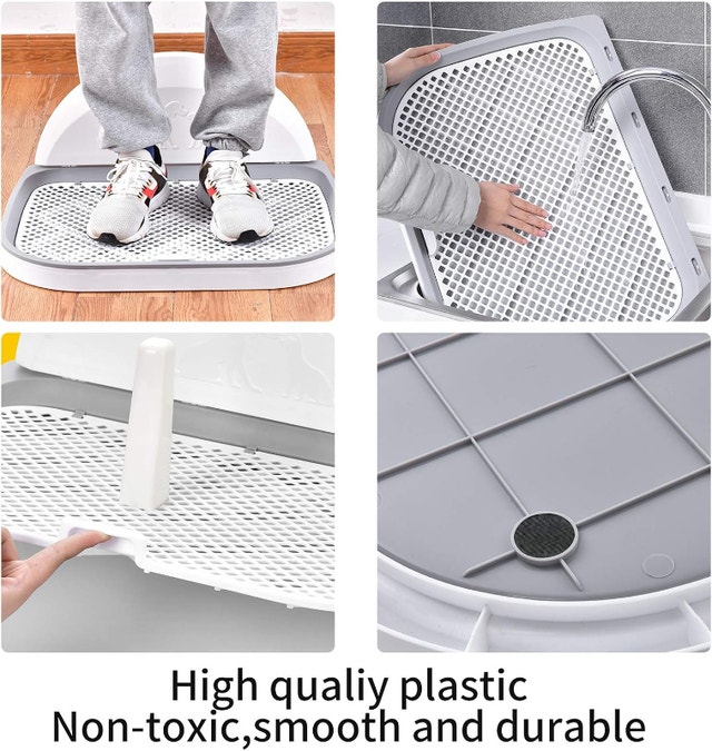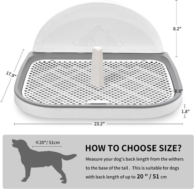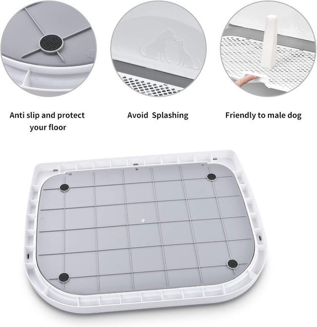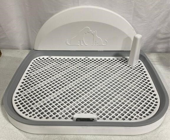 This is a new dog potty tray, perfect for indoor training. It measures 23 x 20 inches. The design helps keep your dog's paws dry as urine flows directly into the tray. It's made of high-quality, non-toxic plastic with a fenced design to prevent splashing and a removable post suitable for male dogs. Four anti-slip feet protect your floors. The mesh grid has holes of 0.8*0.8in (2*2cm) to allow waste to pass through, helping to reduce odor. It's easy to assemble by inserting the wall and post into the tray, and simple to clean. This portable tray is great for apartments, condos, bathrooms, playpens, or kennels, and can also be used outdoors on a porch or deck. Located in Summerside, SE London. Smoke-free home. Message to arrange pick up only.