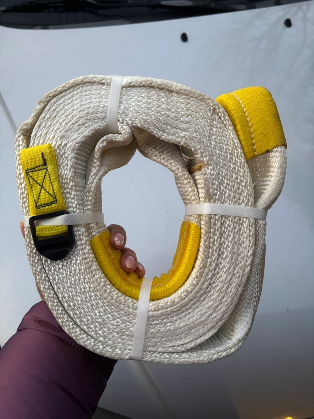 Selling a tow rope in new condition! It's white with yellow accents and appears to be made of a strong, woven material. Perfect for anyone needing a reliable tow rope for their vehicle