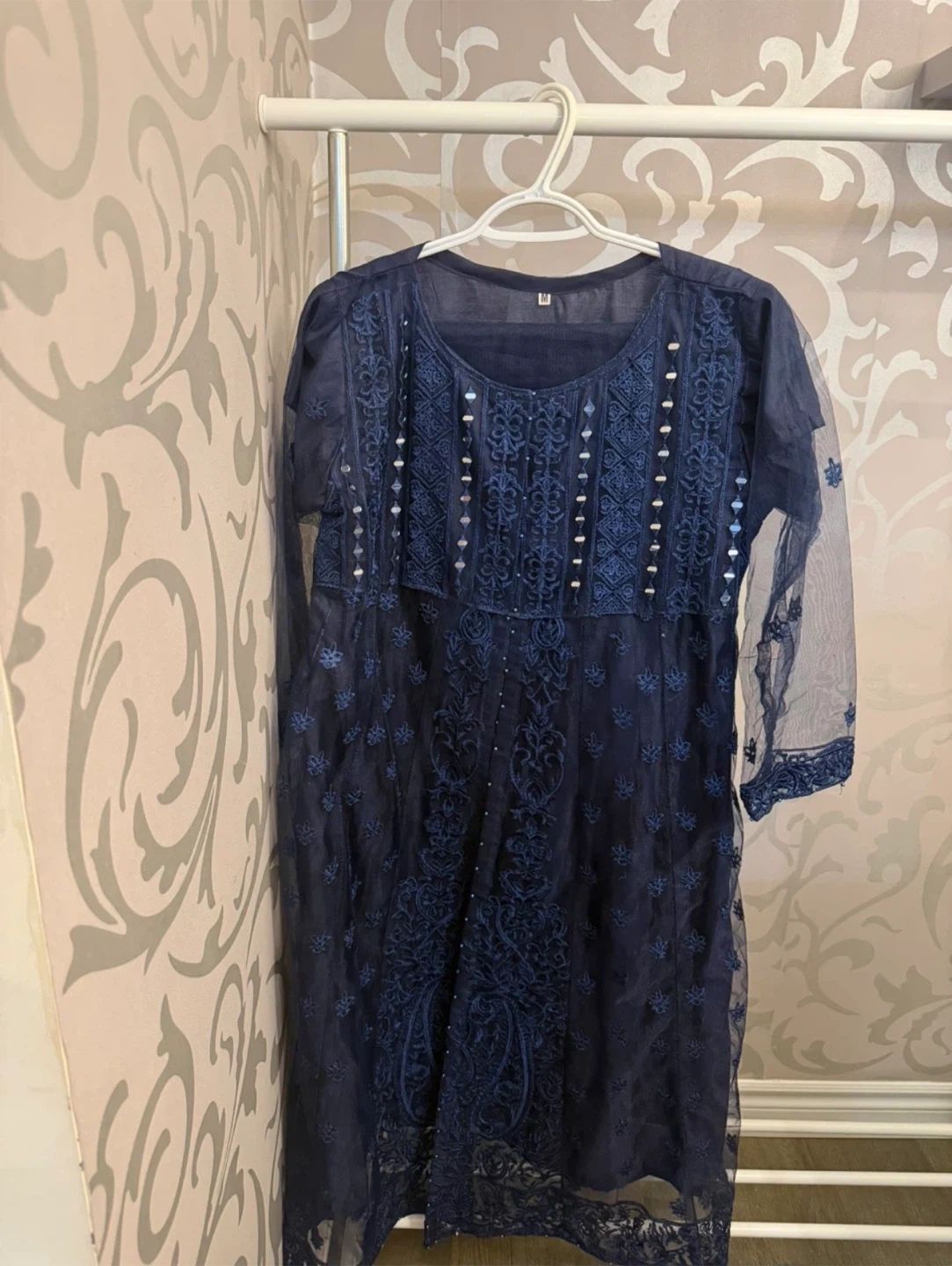 Beautiful navy blue kurti with intricate embroidery and beadwork. Sheer sleeves with embroidered cuffs. Size is medium.