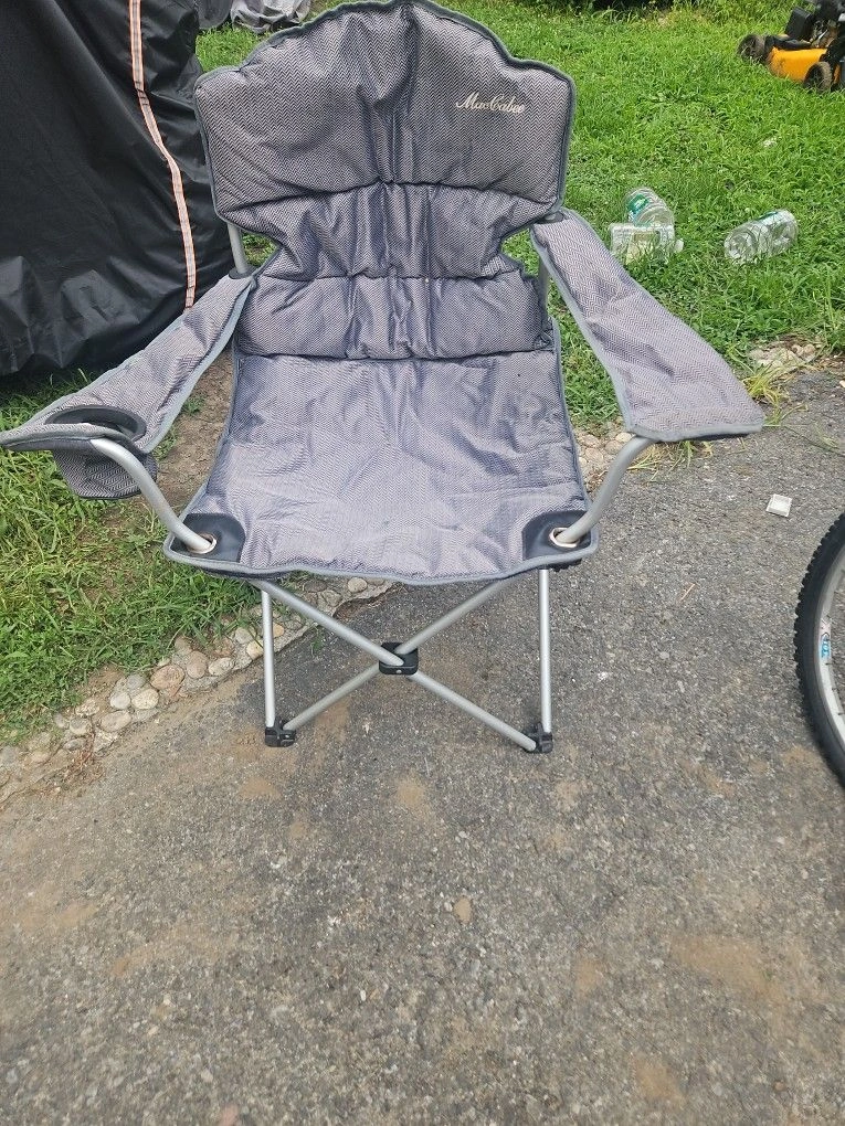 This is a padded Maccabe armchair, perfect for picnics or outdoor events. It features a convenient cup holder and is foldable for easy transport and storage.
