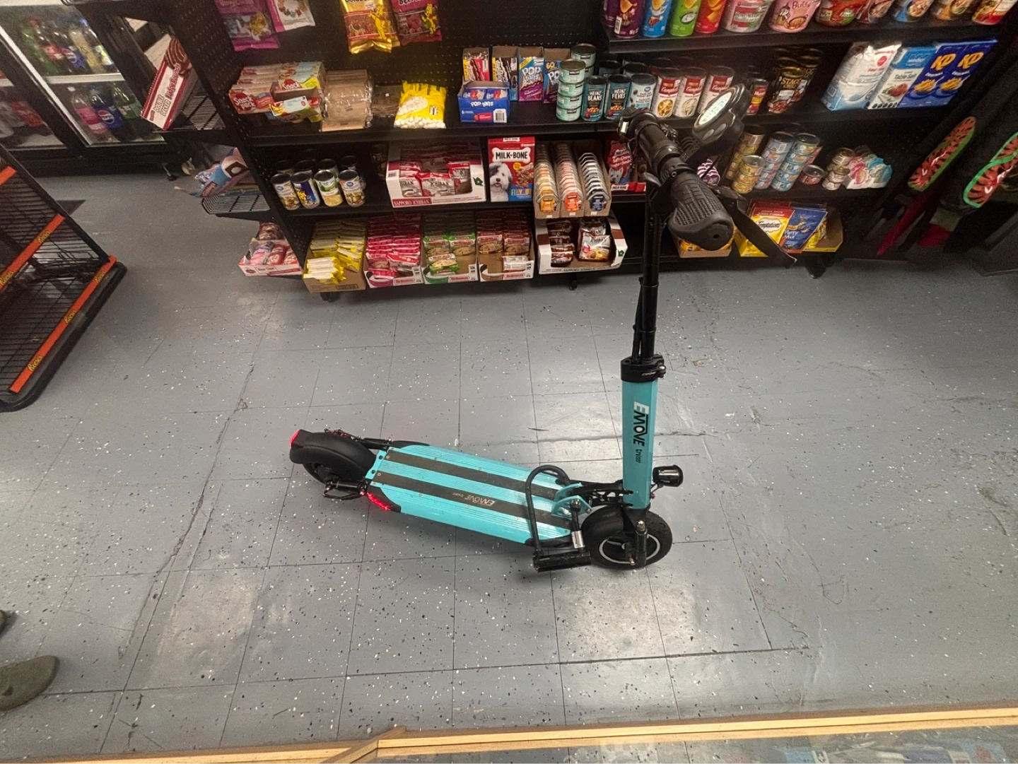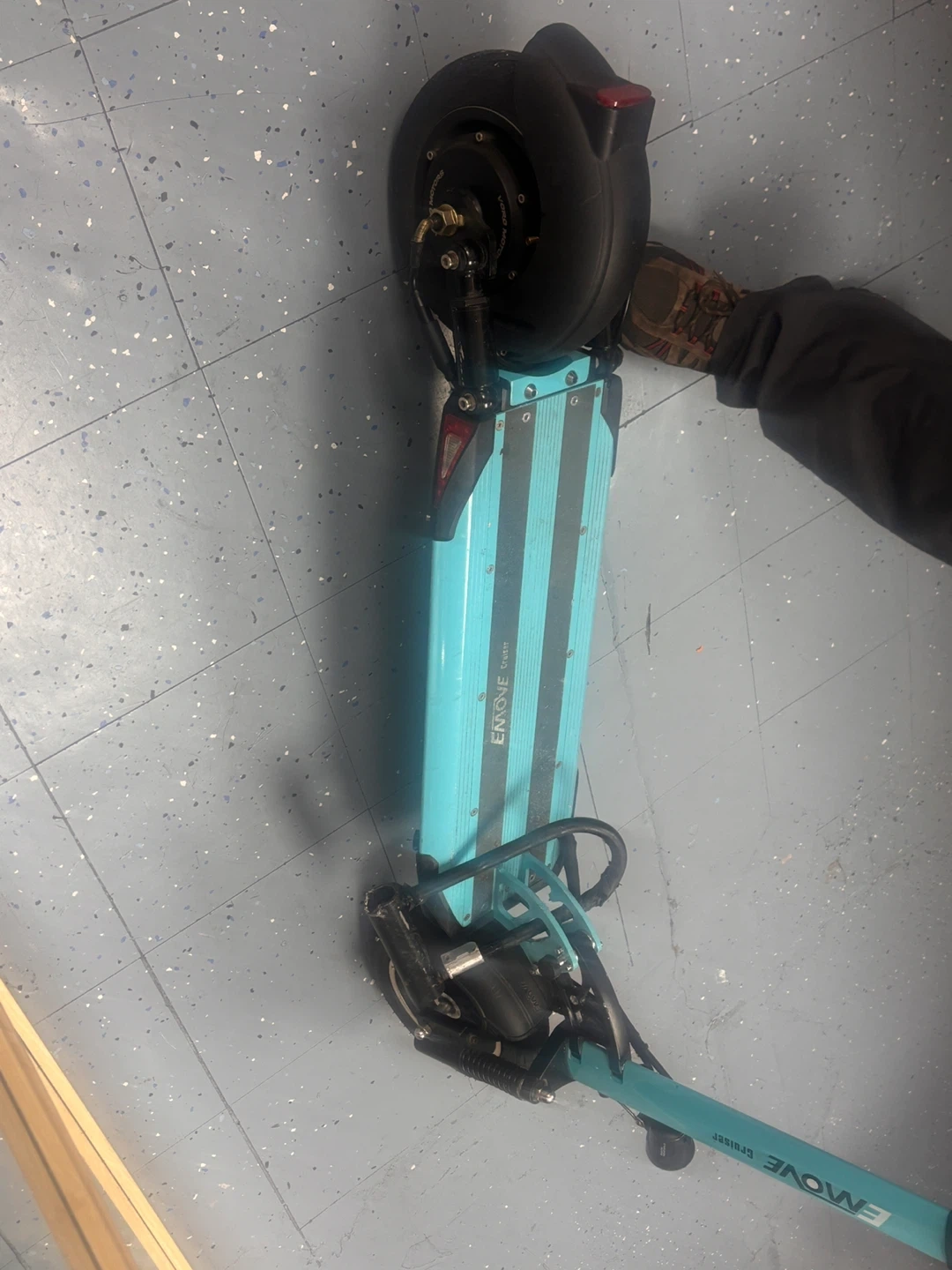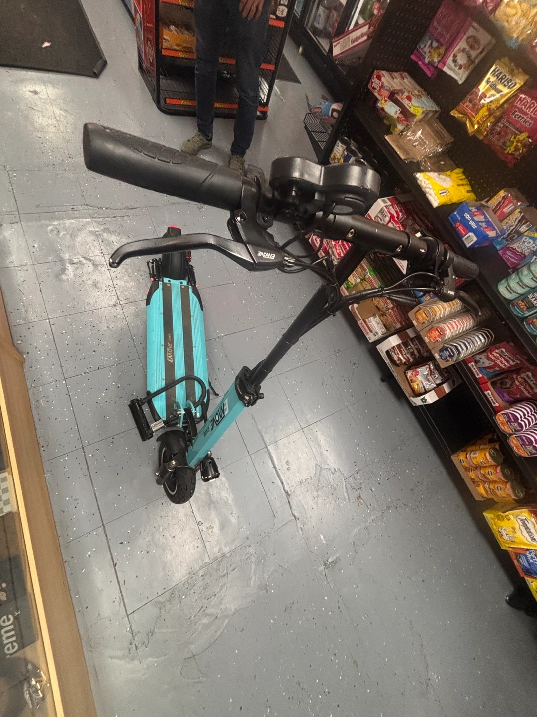 This is an EMOVE electric scooter in a bright teal colour. It has a digital display showing gear and mileage. Great for zipping around town!