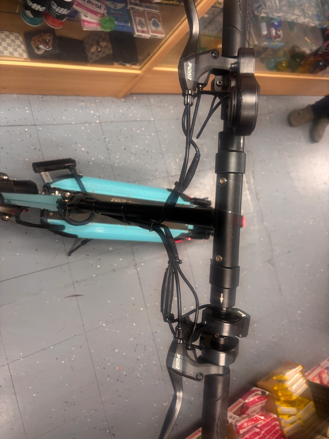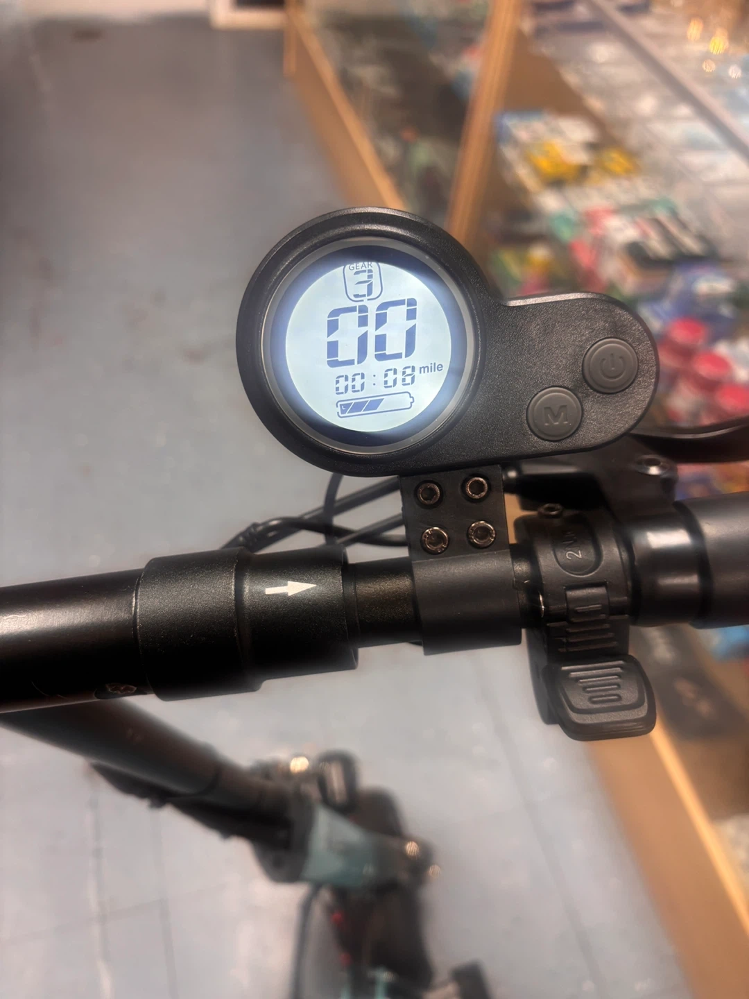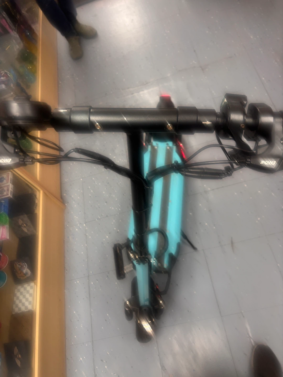 This is an EMOVE electric scooter in a bright teal colour. It has a digital display showing gear and mileage. Great for zipping around town!