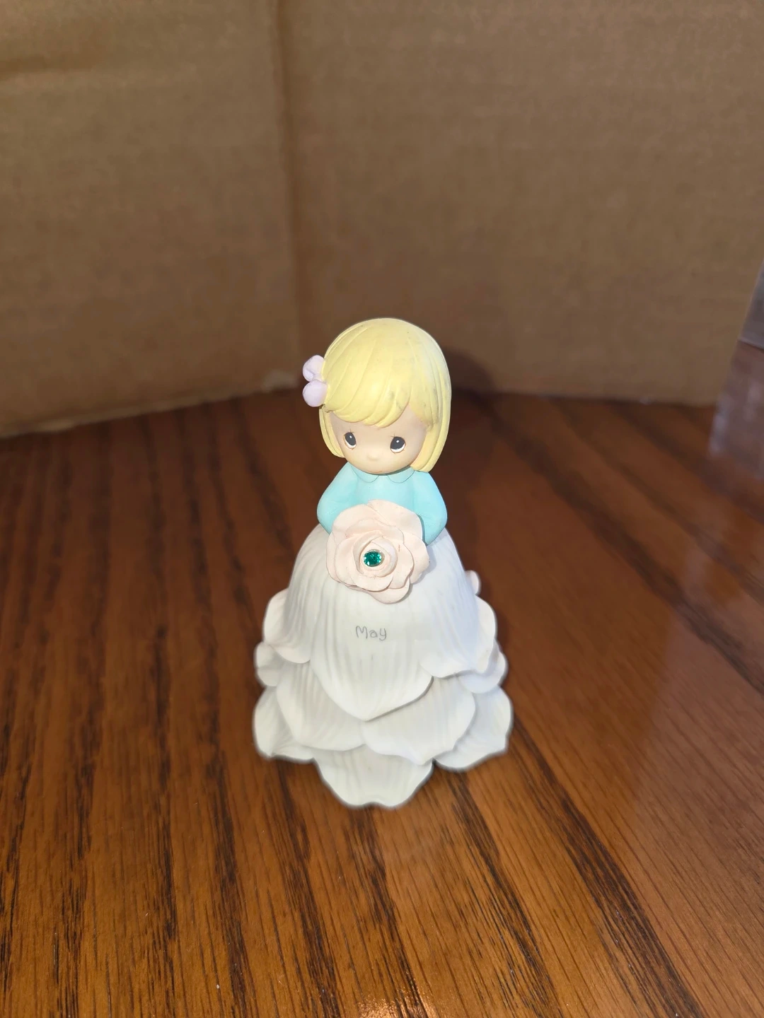 This is a Precious Moments figurine with "May" written on the skirt. It depicts a girl holding a rose. The figurine is made of porcelain and has a light blue shirt and blonde hair.