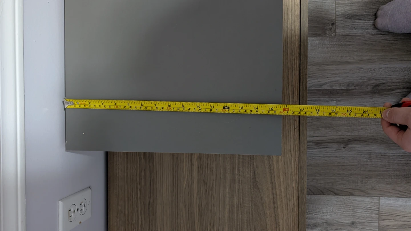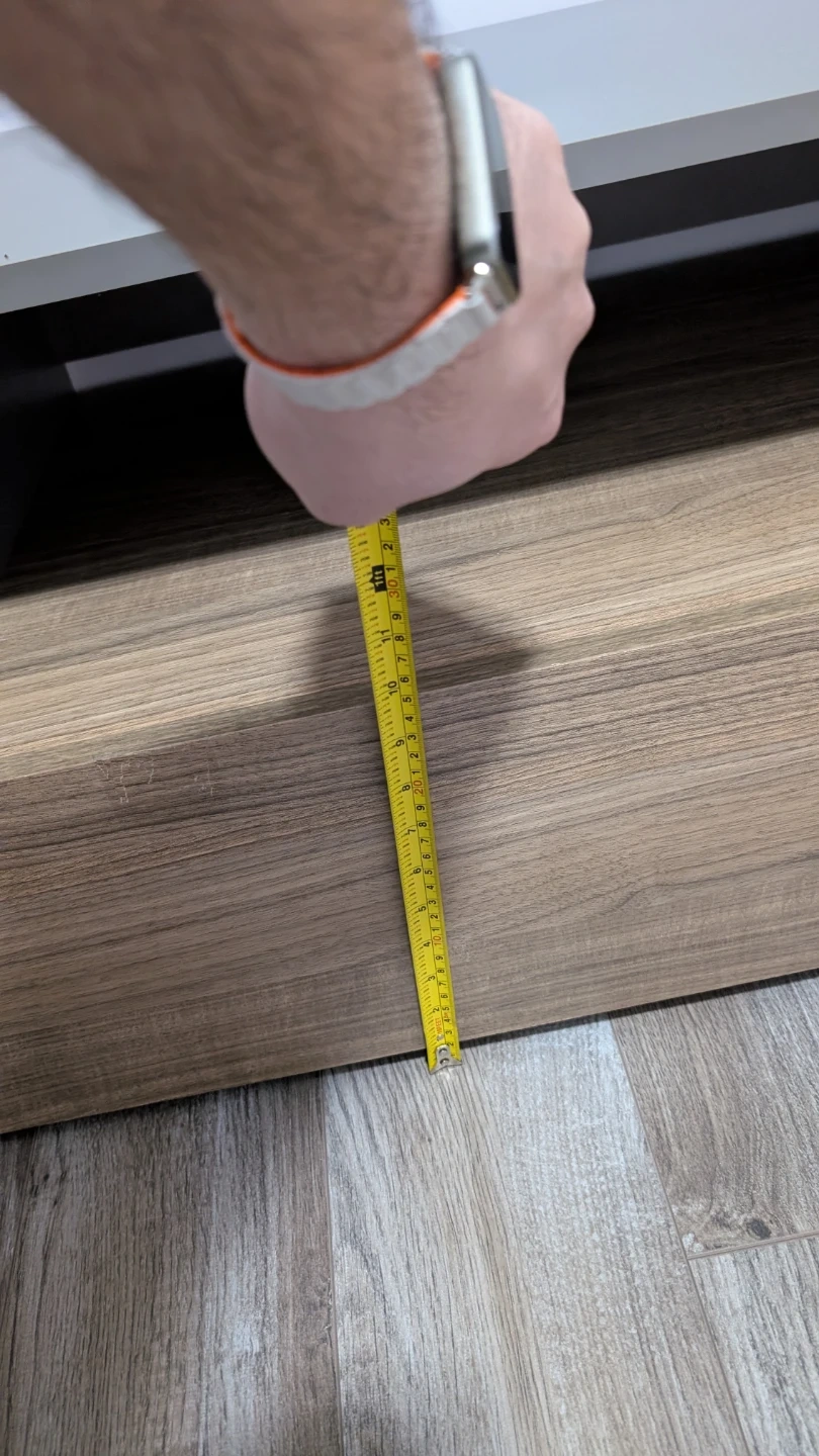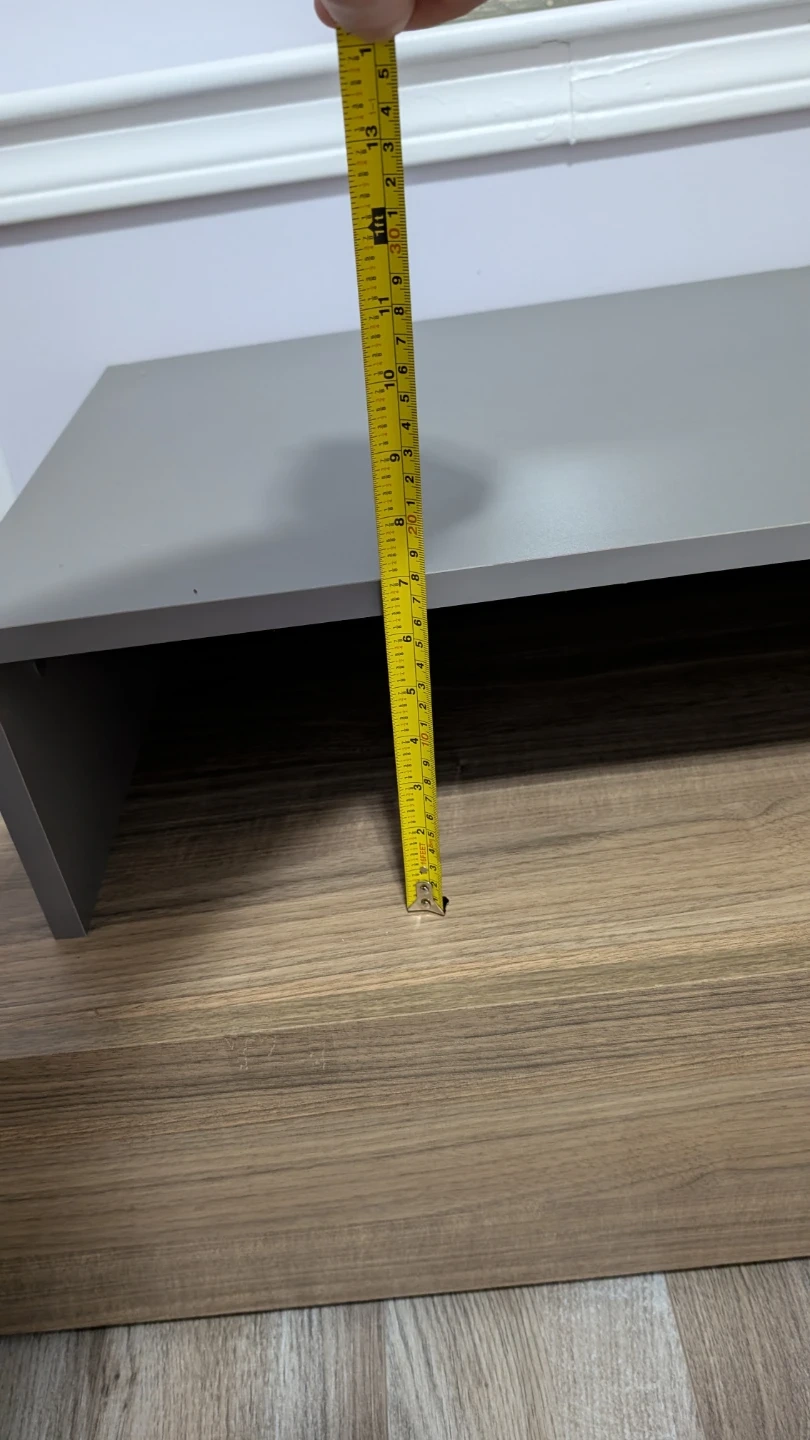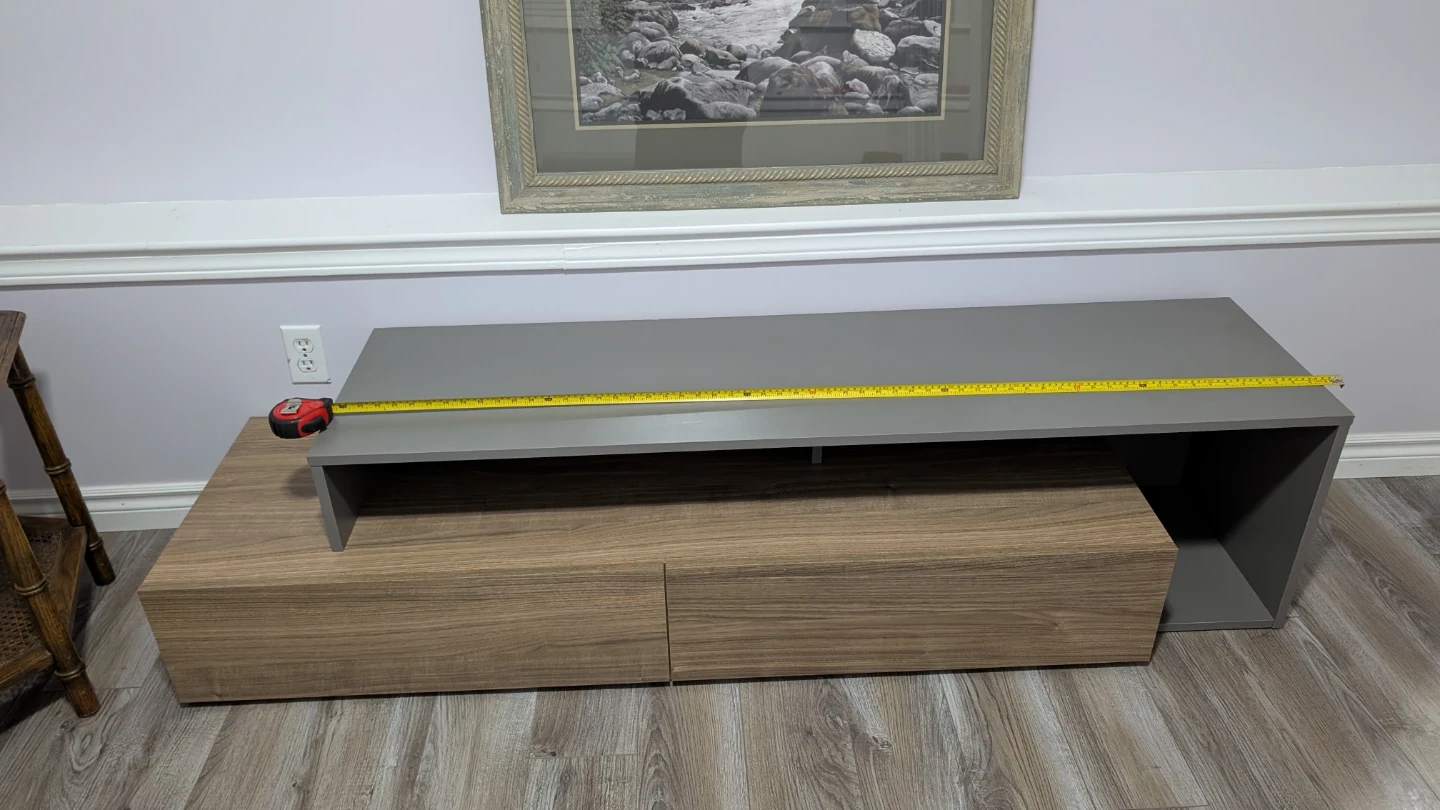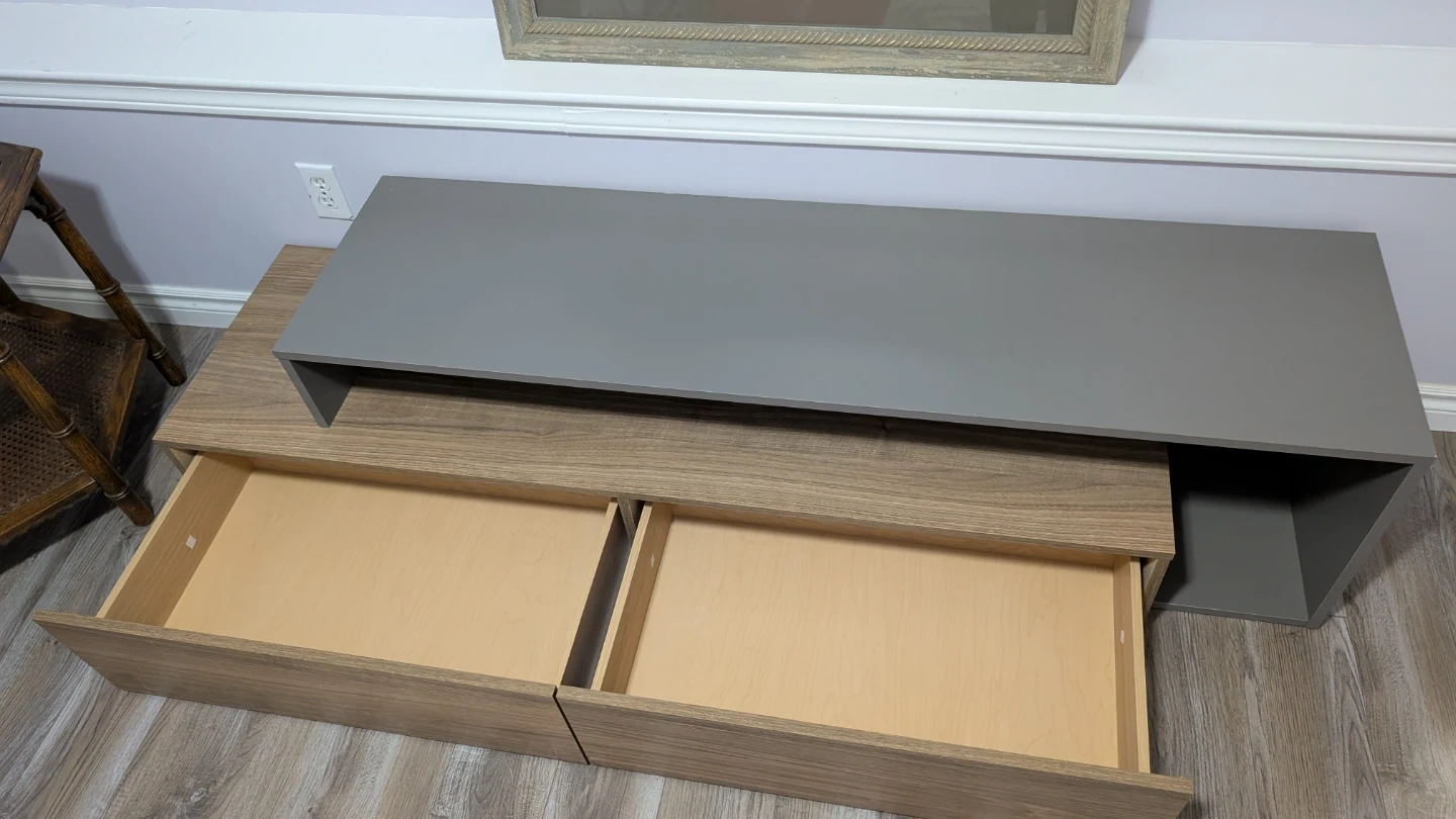 This modern TV console grey top surface and wood-grain drawers. It measures approximately 71 inches in length. It has two drawers and an open shelf compartment.
