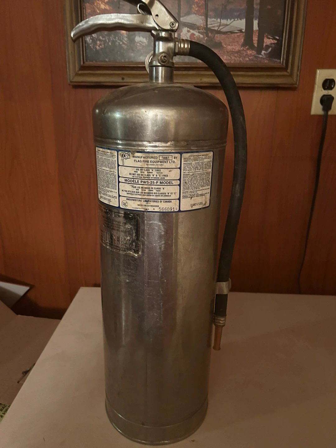 Buy & SellFlag Fire Equipment Ltd. PW5-25-F Fire ExtinguisherFlag Fire Equipment Ltd. PW5-25-F Fire Extinguisher$100Vintage fire extinguisher by Flag Fire Equipment Ltd. Model PW5-25-F. Made in 1982. This is a A B C extinguisher can even put water in itConditionGoodWHERE TO MEETCheck LocationView MapSELLERverifiedBrendaShaughnessy650 reviews0 chats·0 favorites·1 viewsSEND CHAT TO SELLERHi Brenda! I’m interested in your listing.Hi Brenda! I’m interested in your listing.Get the Karrot app to chatSign In to chat