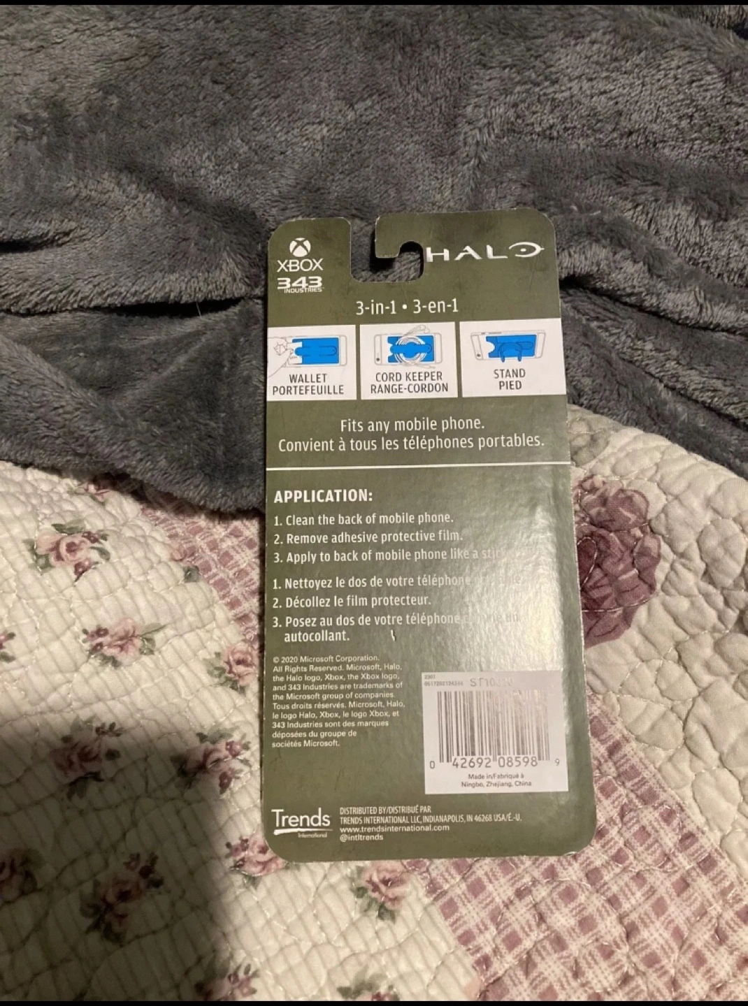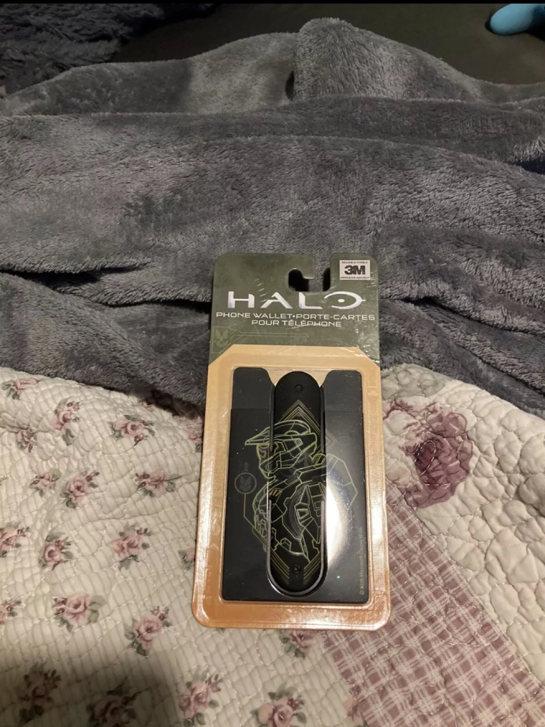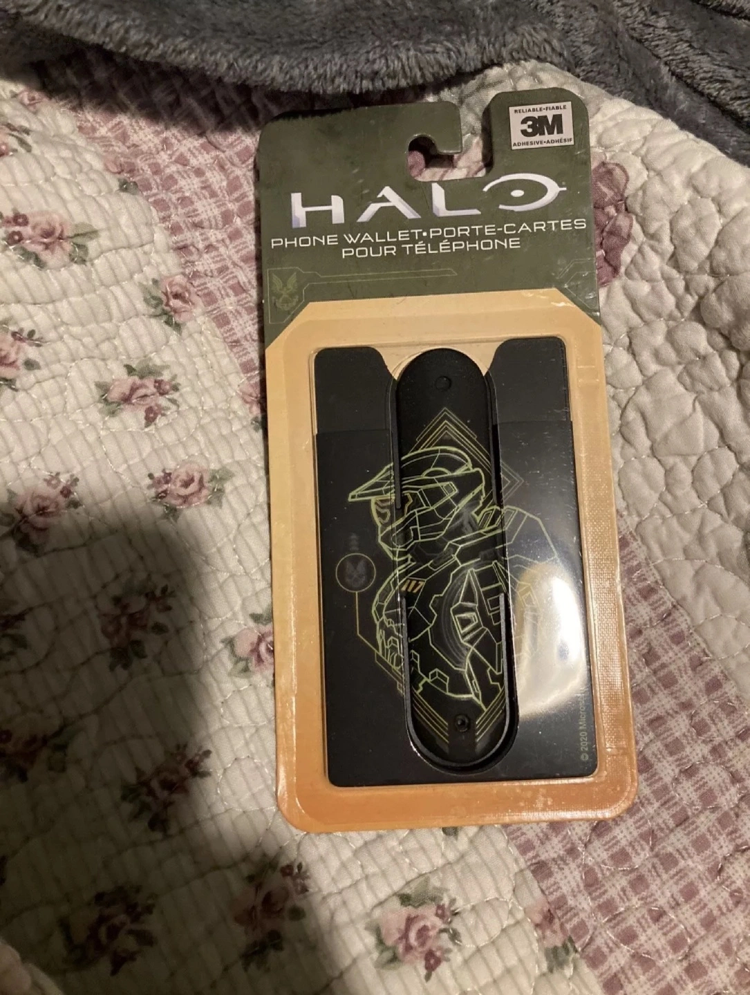 Phone wallet with Master Chief design. 3-in-1: wallet, cord keeper, and stand. Fits most phones.