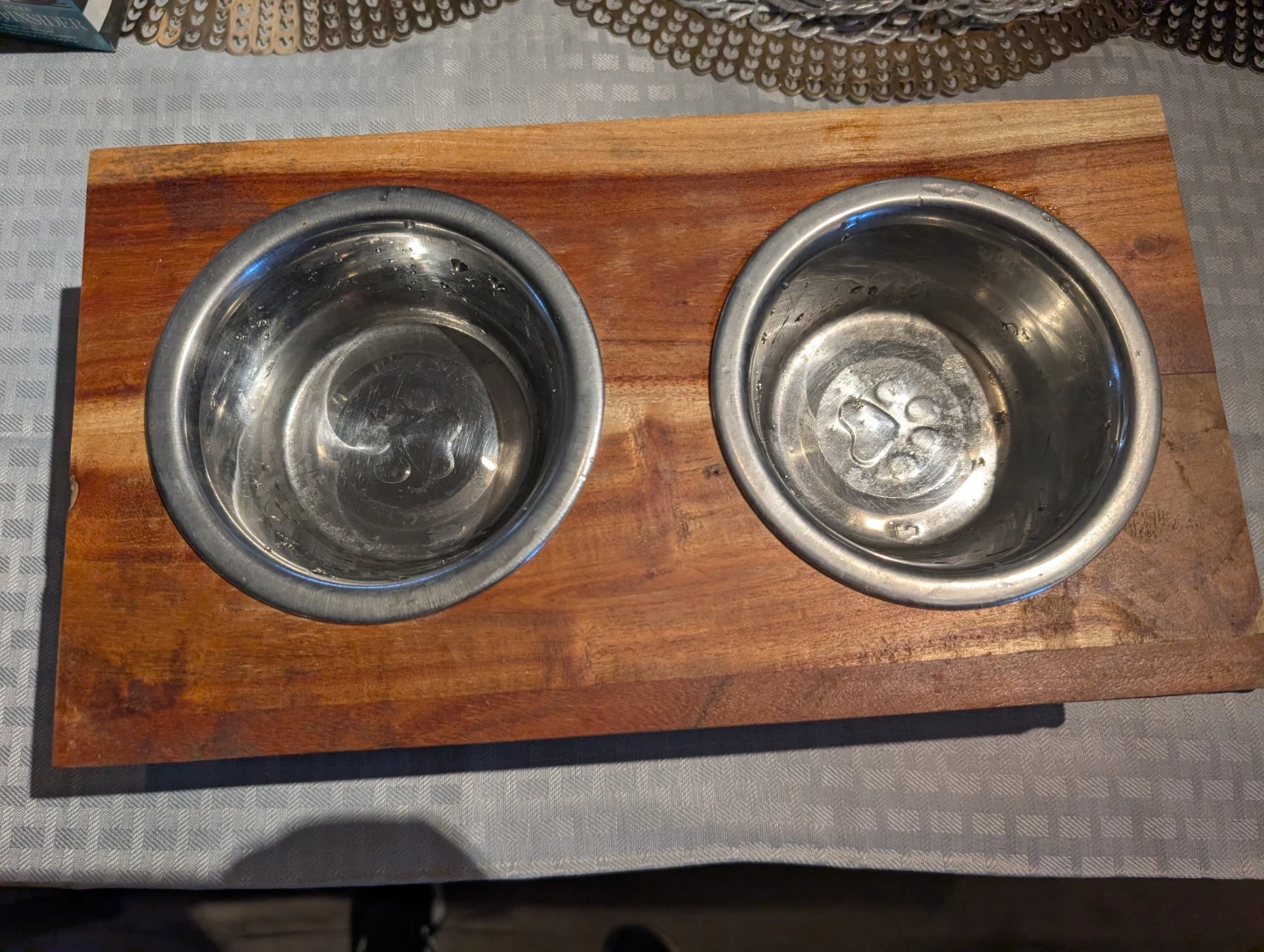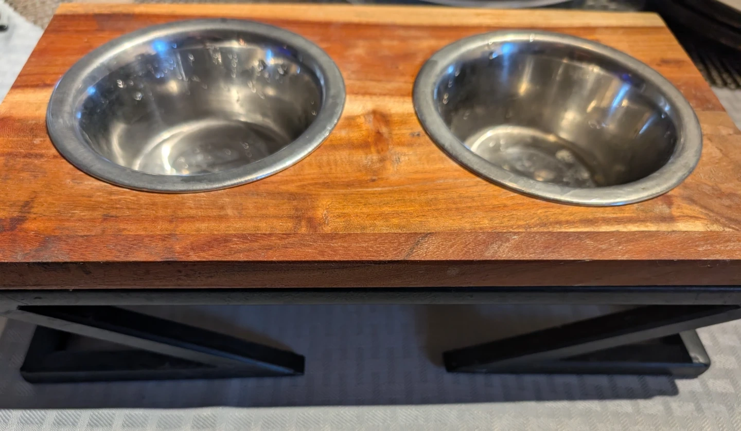 This is a set of two stainless steel pet bowls mounted on a wooden stand. The bowls are removable for easy cleaning. The stand is made of wood with a natural finish. It's great for feeding both food and water to your furry friends!