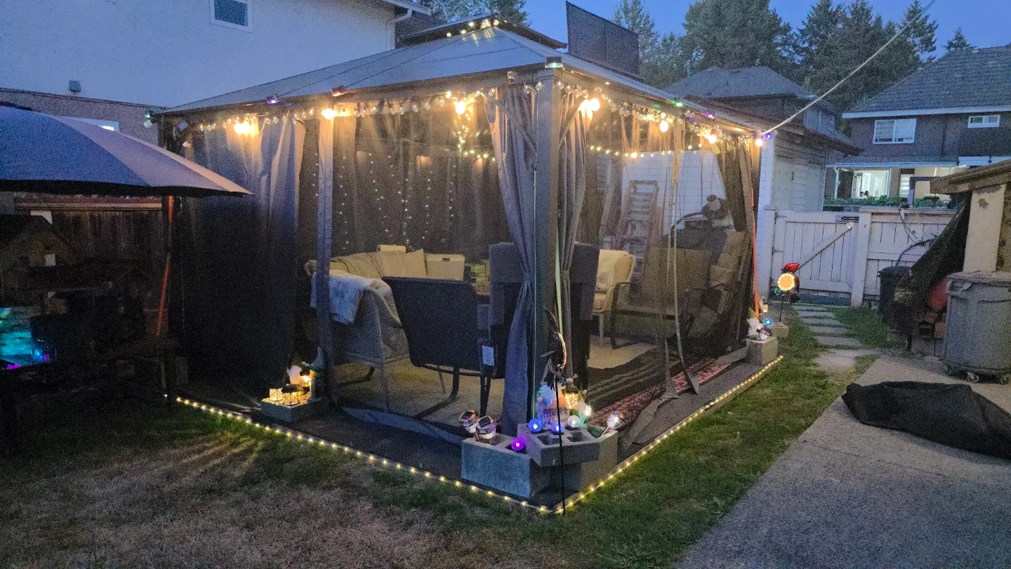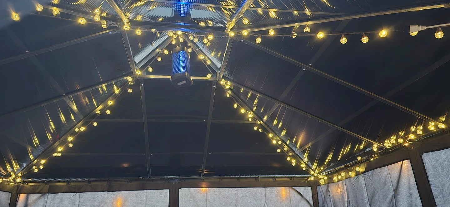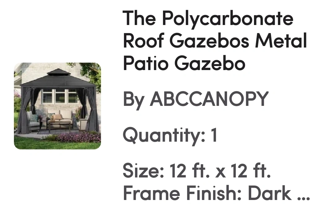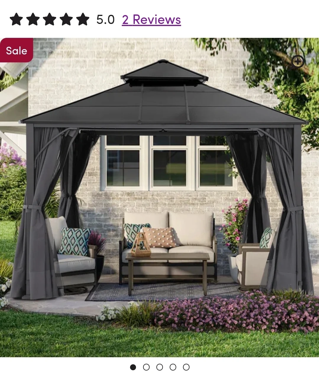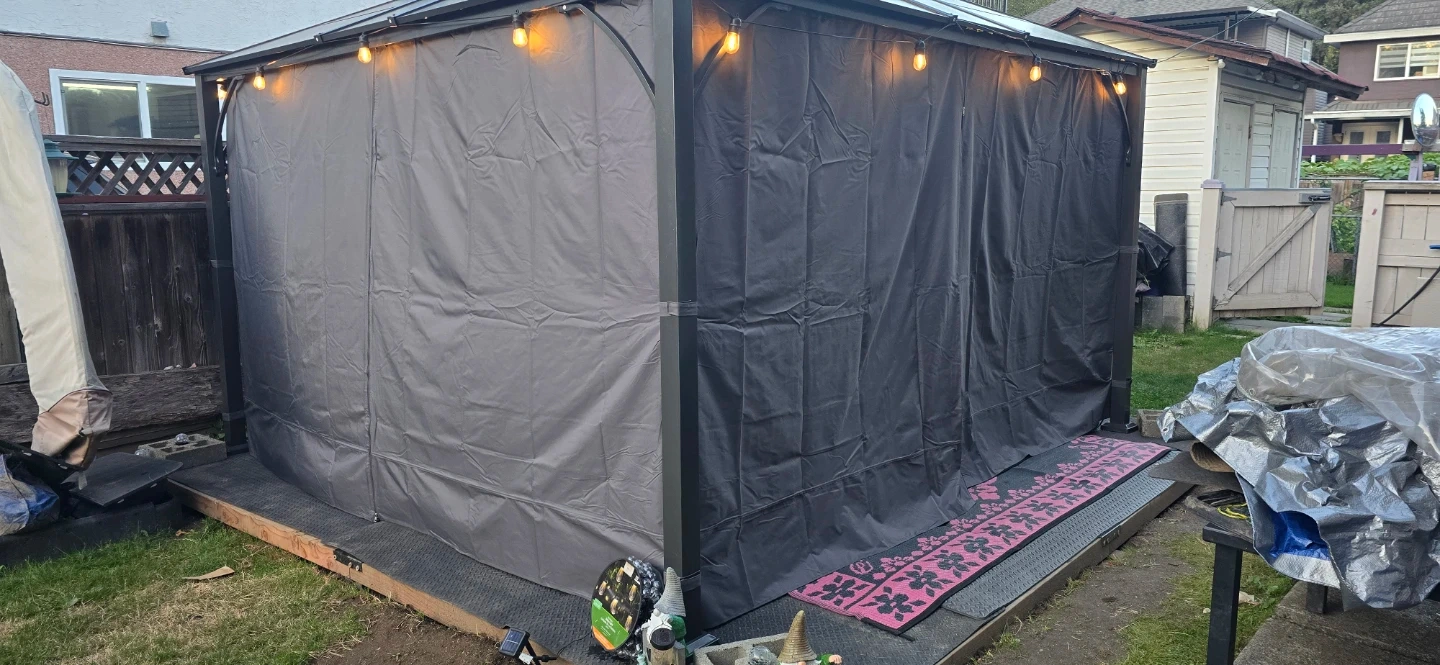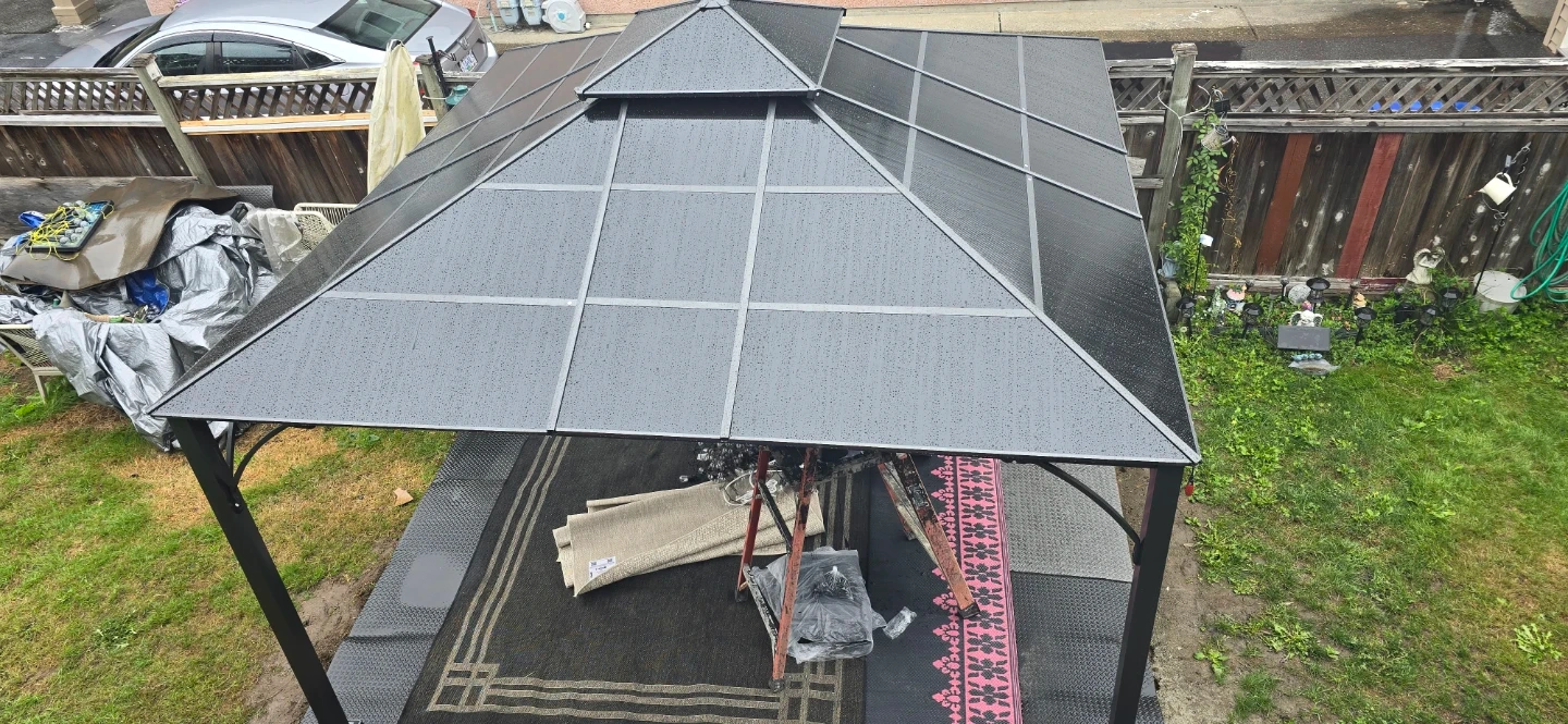 This gazebo is perfect for backyard gatherings. It comes with mosquito netting to keep bugs out. Provides a sheltered outdoor space for entertaining or relaxing.Used for 6 mos of one season. Disassembled ready to go in original box. Privacy panels got torn due to wind but repaired hence the price reduction other then that in brand new condition. Weatherproof polycarbonate Roof. Hardtop gazebo sturdy and stable structure practical mesh netting and privacy curtains, arch roof design with spacious space and ceiling hook.